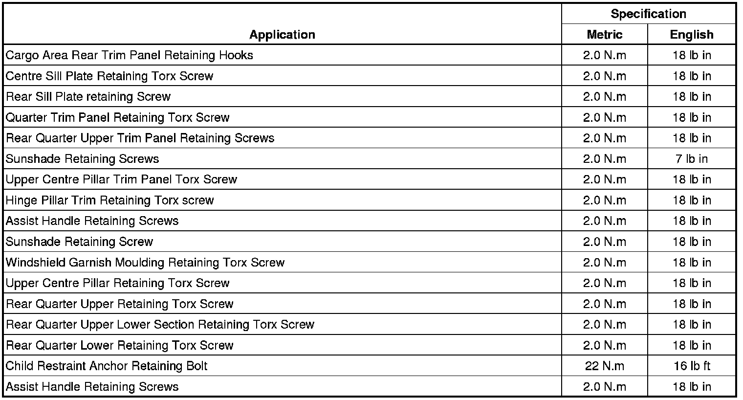 Interior Trim and Paneling - Fastener Tightening Specifications