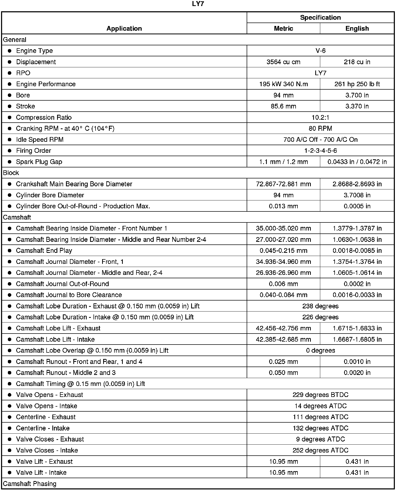 Engine Mechanical Specifications (RPO LY7 VIN 7)