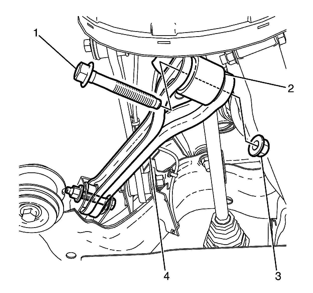 Important: The lower control arm to knuckle retaining bolt (2) and NEW nut (1) must not to be fully tightened at this stage.