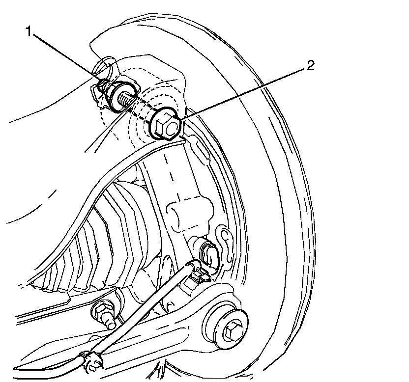 11. Loosen the upper control arm to knuckle retaining bolt (2) and nut (1).