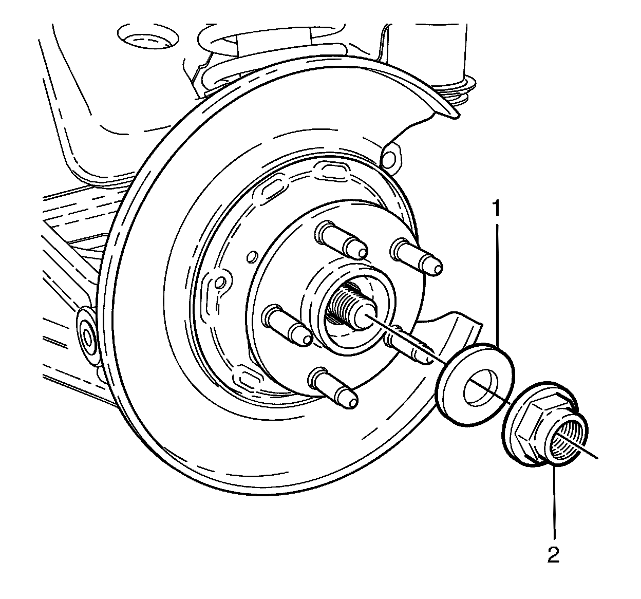 5. Remove the wheel drive shaft retaining nut (2) and washer (1).