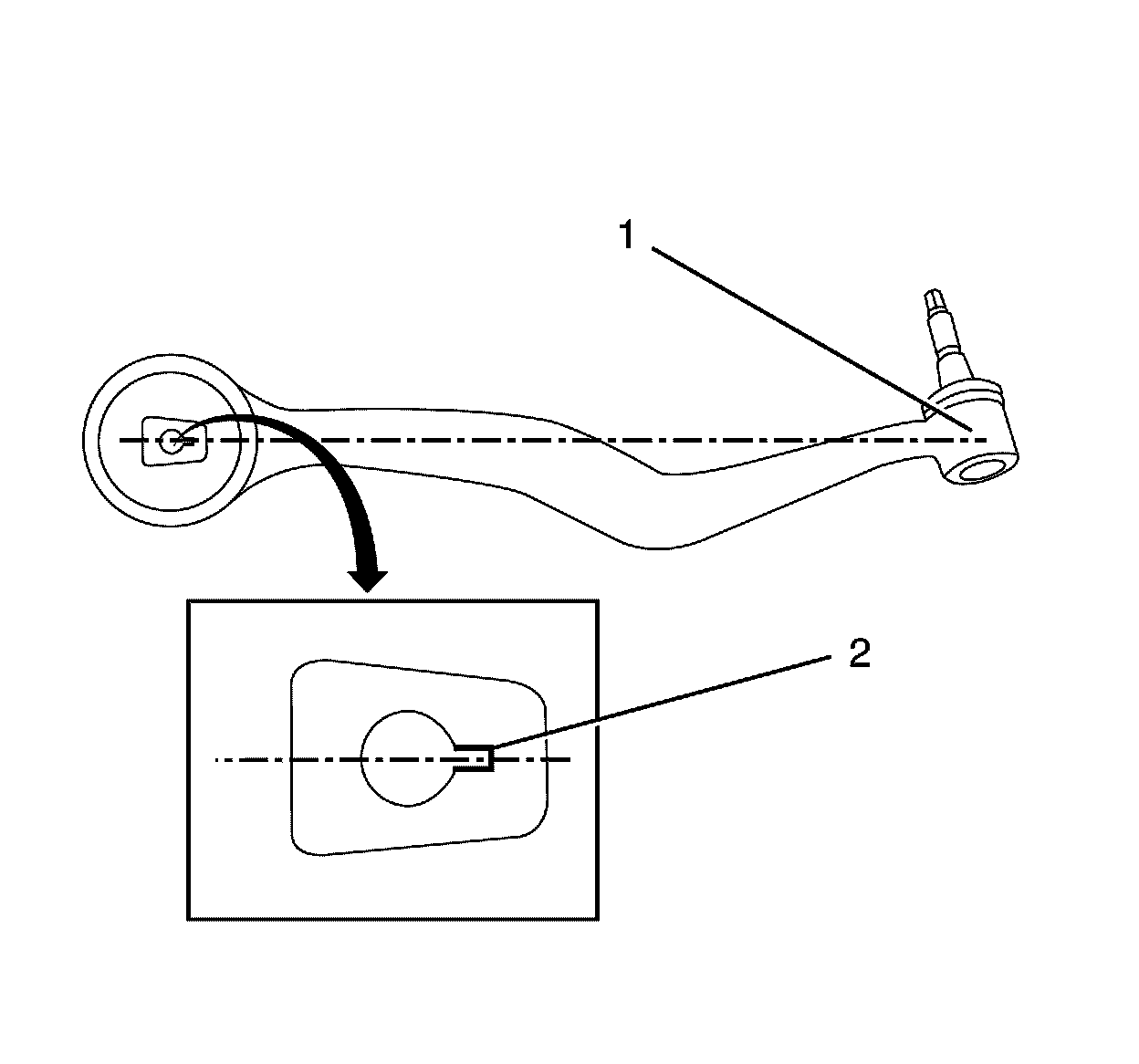 1. Position the front caster arm bushing so that the cut out (2) aligns with the ball joint (1).