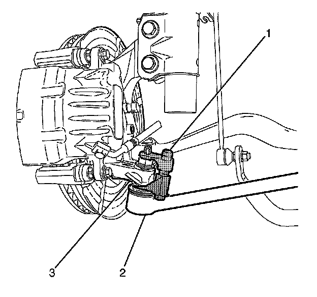 4. Using J-42188-B (1) disconnect the control arm (2) from the steering knuckle (3).