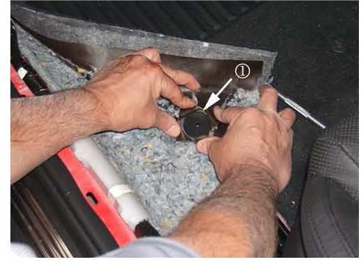 10. Remove and discard the old retainer (1) and pin along with any loose carpet fibers that may interfere with the installation of the new retainer/pin.
