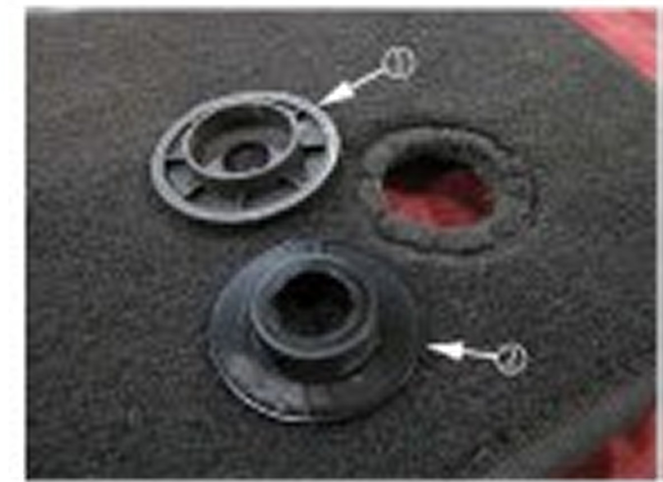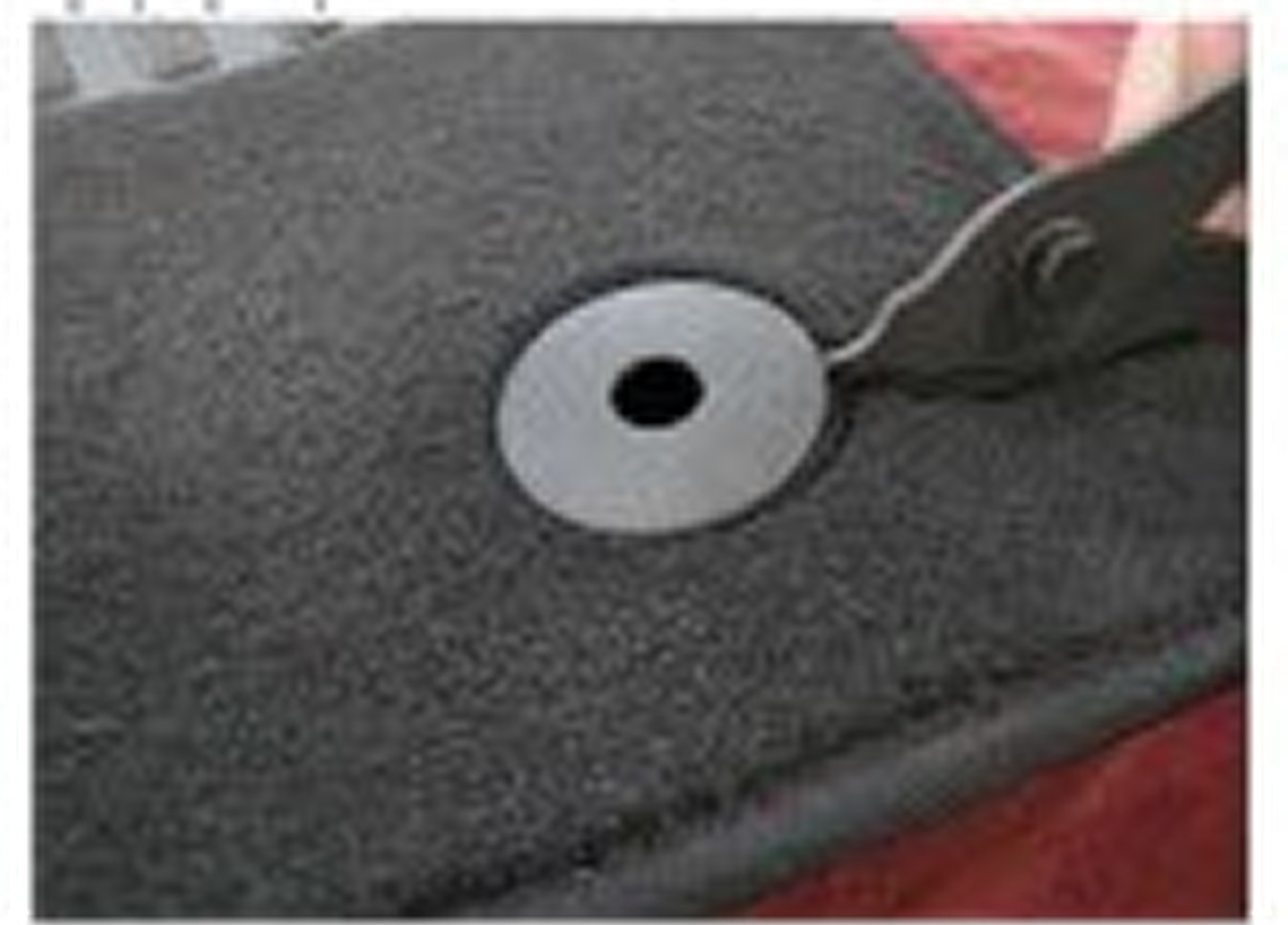 9. Remove the floor mat(s) and place the floor mat(s) in the trunk of the vehicle while the adhesive cures. Allow the adhesive to cure for 24 hours prior to installing the floor mat. The adhesive will secure the retainer to the backside of the mat and prevent movement of the retainers. The customer may reinstall the floor mat(s) the following day.