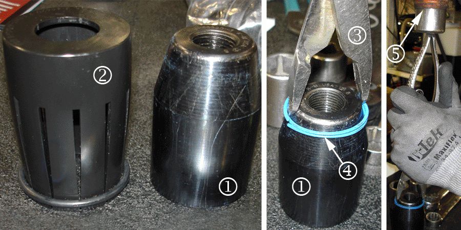 Apply a small amount of grease to the tapered end of the J-46620 tool (1) to aid in sliding the big clamping ring (4) into position on the tool. Install the clamping ring onto the J-46620 tool using external snap ring pliers (3) or equivalent and a hammer (5). Use the hammer (5) to move the clamping ring (4) over the tapered end of the tool (1). Use the second part of the J-46620 tool (2) to slide the clamping ring (4) over the ball joint boot.