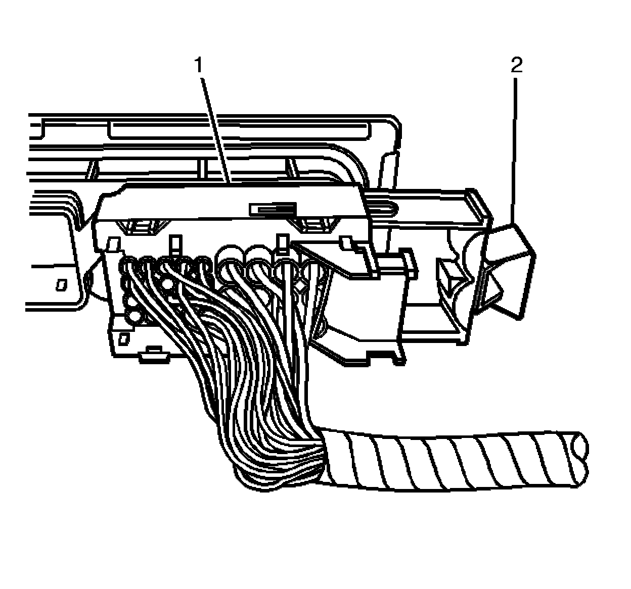 5. Lock the transmission control module electrical connector securely to the transmission control module by pushing the retainer (2) toward the electrical connector (1) until fully seated.