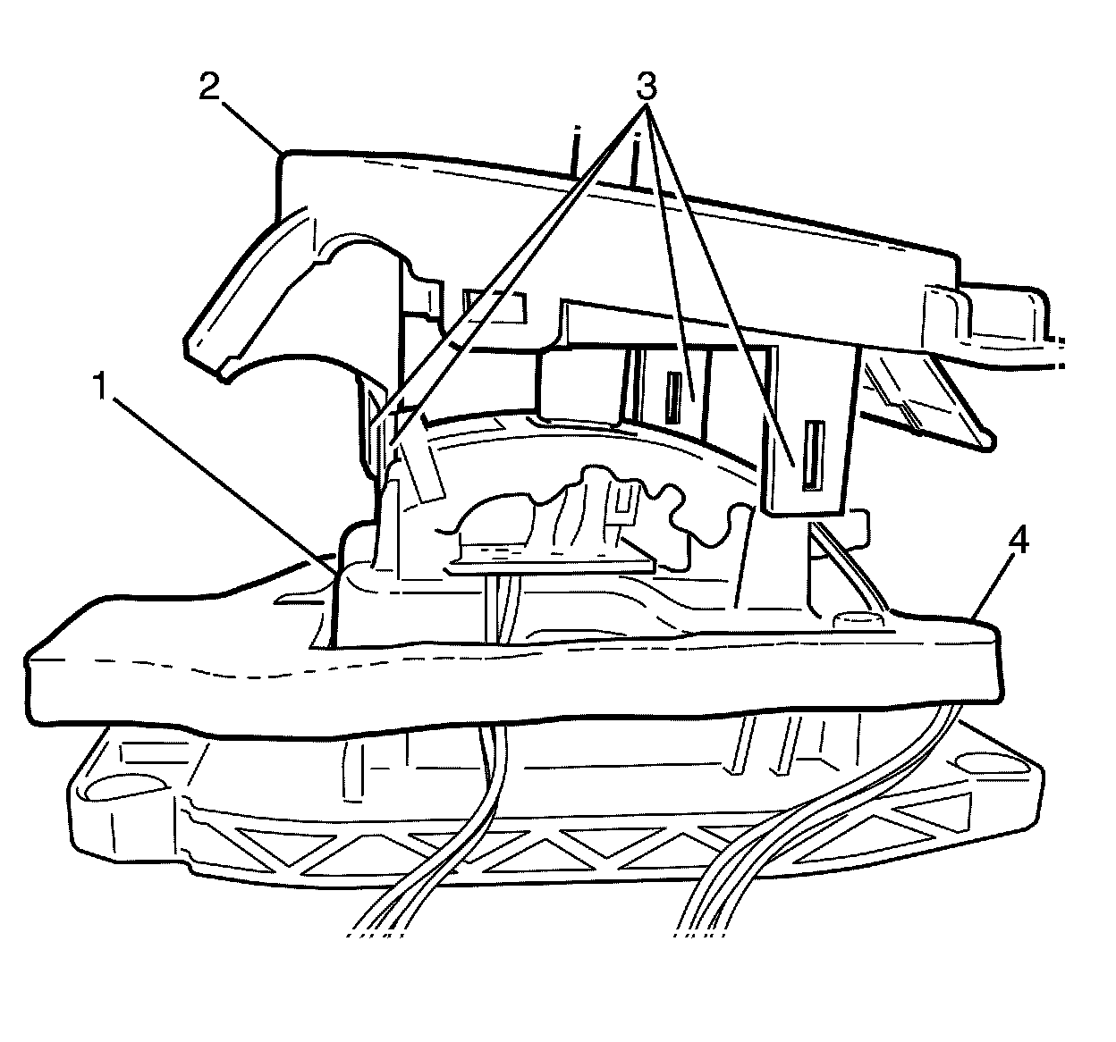 5. Disconnect the selector lever housing (2) from the base (1) by depressing the four retaining tabs (3).