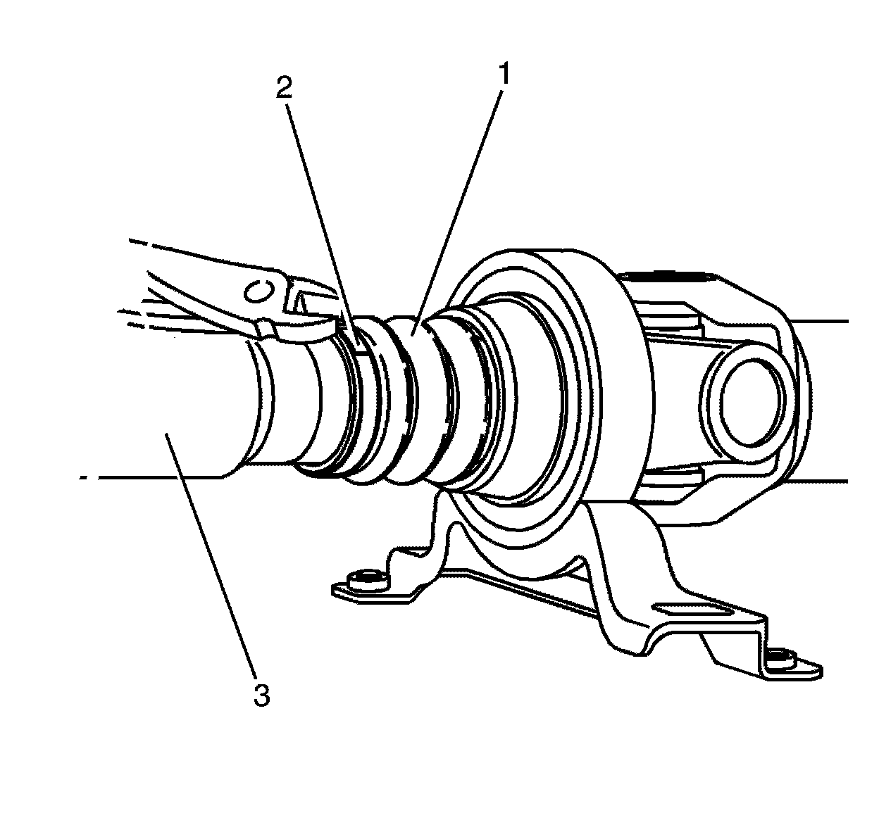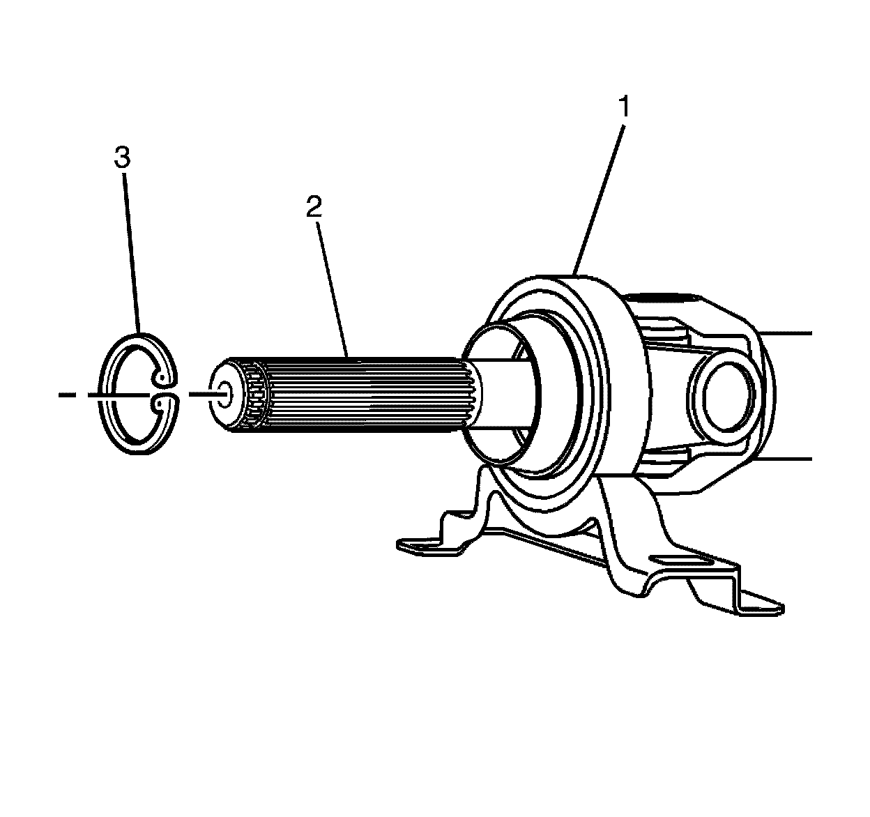 2. Install the propeller shaft (2) to centre bearing (1) NEW retaining circlip (3).