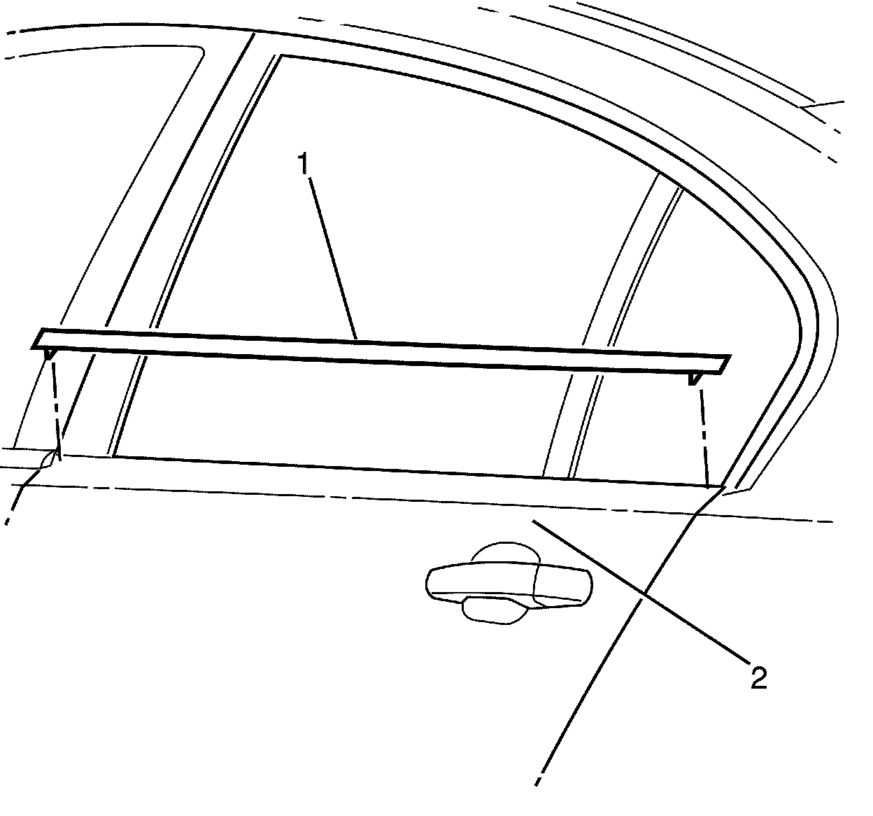 1. Install the rear door outer belt sealing strip (1) to the rear door (2).