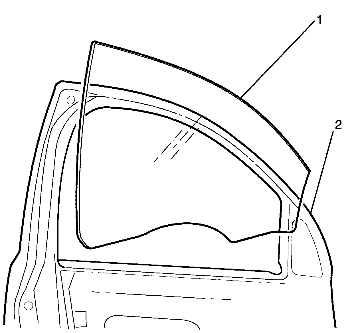 13. Remove the window (1) by tilting it forward then pulling it up and out of the door (2).