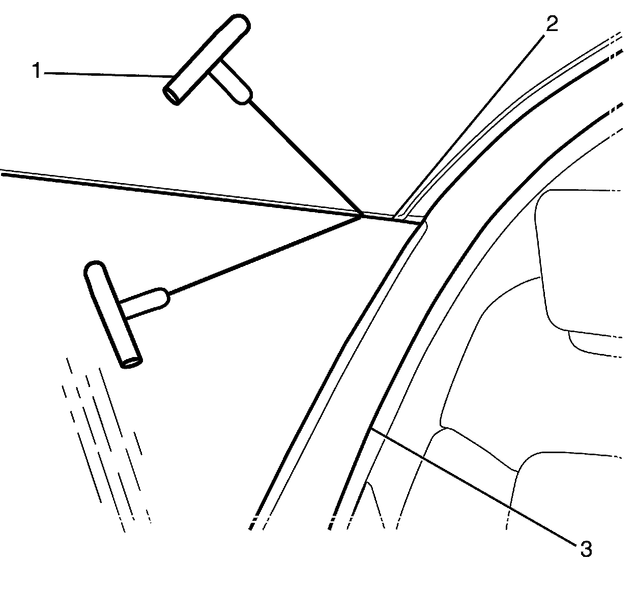 Important: Use a suitable tool to install the piano wire from J-36020 (1) through the urethane at a upper corner of the windshield (2).