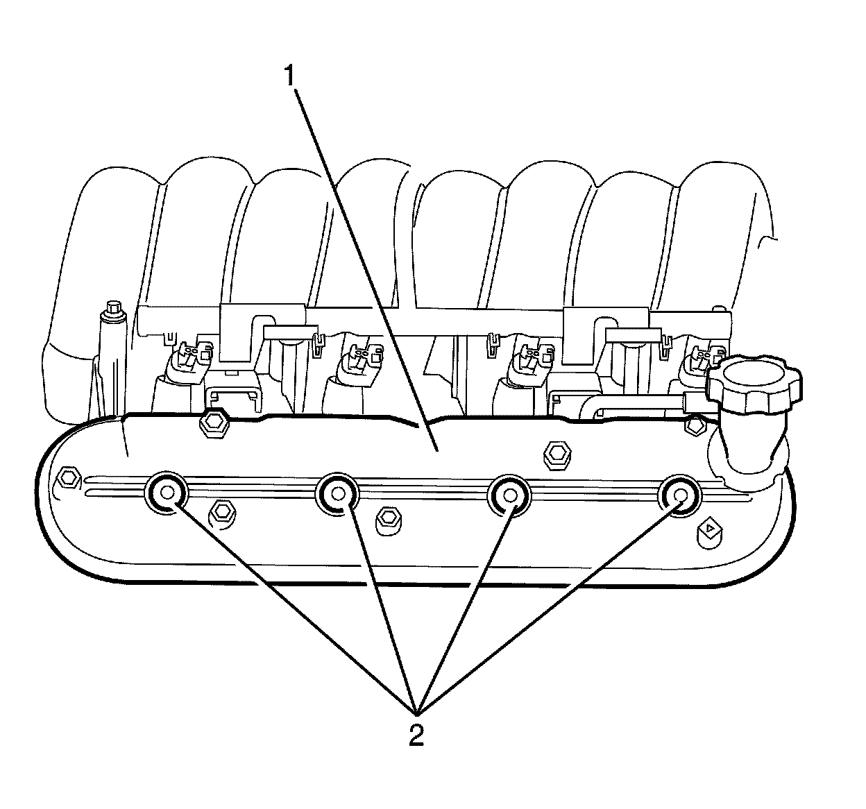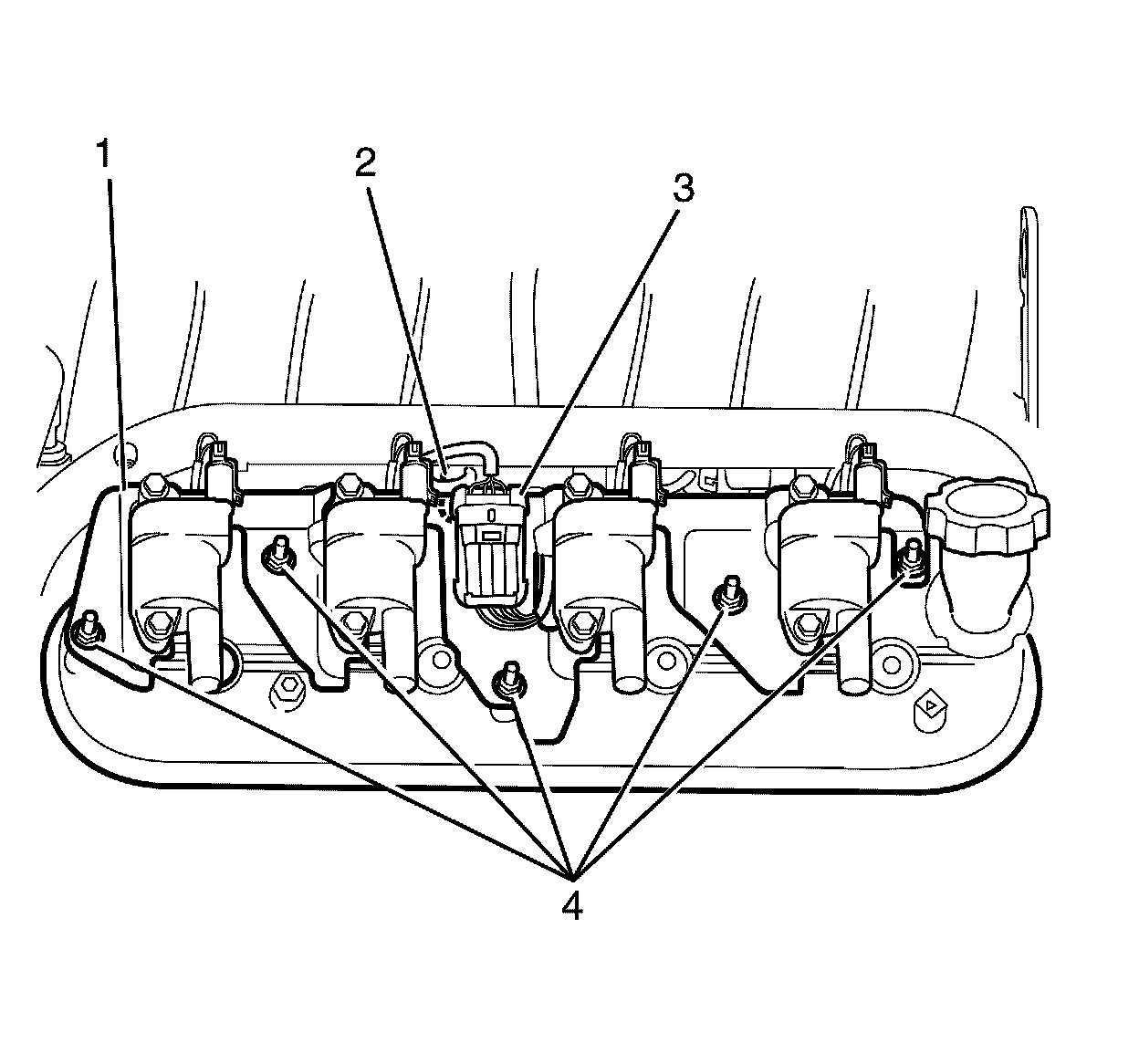 6. Remove the ignition coil assembly to valve rocker arm cover retaining studs (4).