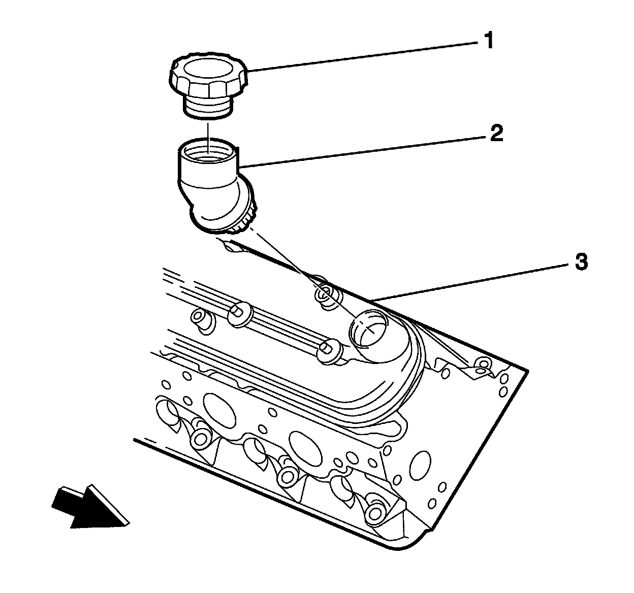 12. Remove the oil fill tube (2), from the right hand valve rocker arm cover (3) if required.