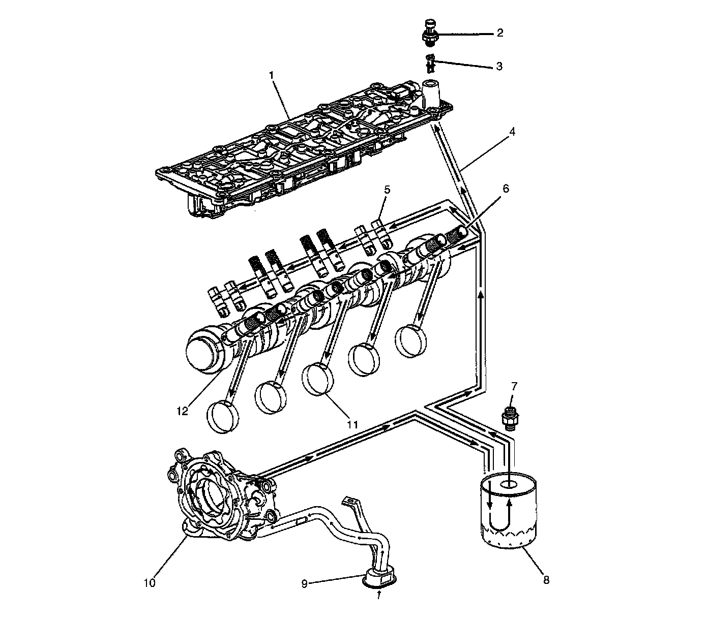 Oil is then directed from the filter to the upper main oil galleries (4). Oil from the left upper oil gallery is directed to the crankshaft bearings (11) and camshaft bearings (12). Oil that has entered both the upper main oil galleries also pressurizes the valve lifter assemblies (5 and 6) and is then pumped through the pushrods to lubricate the valve rocker arms and valve stems. Oil returning to the pan is directed by the crankshaft oil deflector. The oil pressure sensor (2) and valve lifter oil filter (3) a is located at the top rear of the engine.