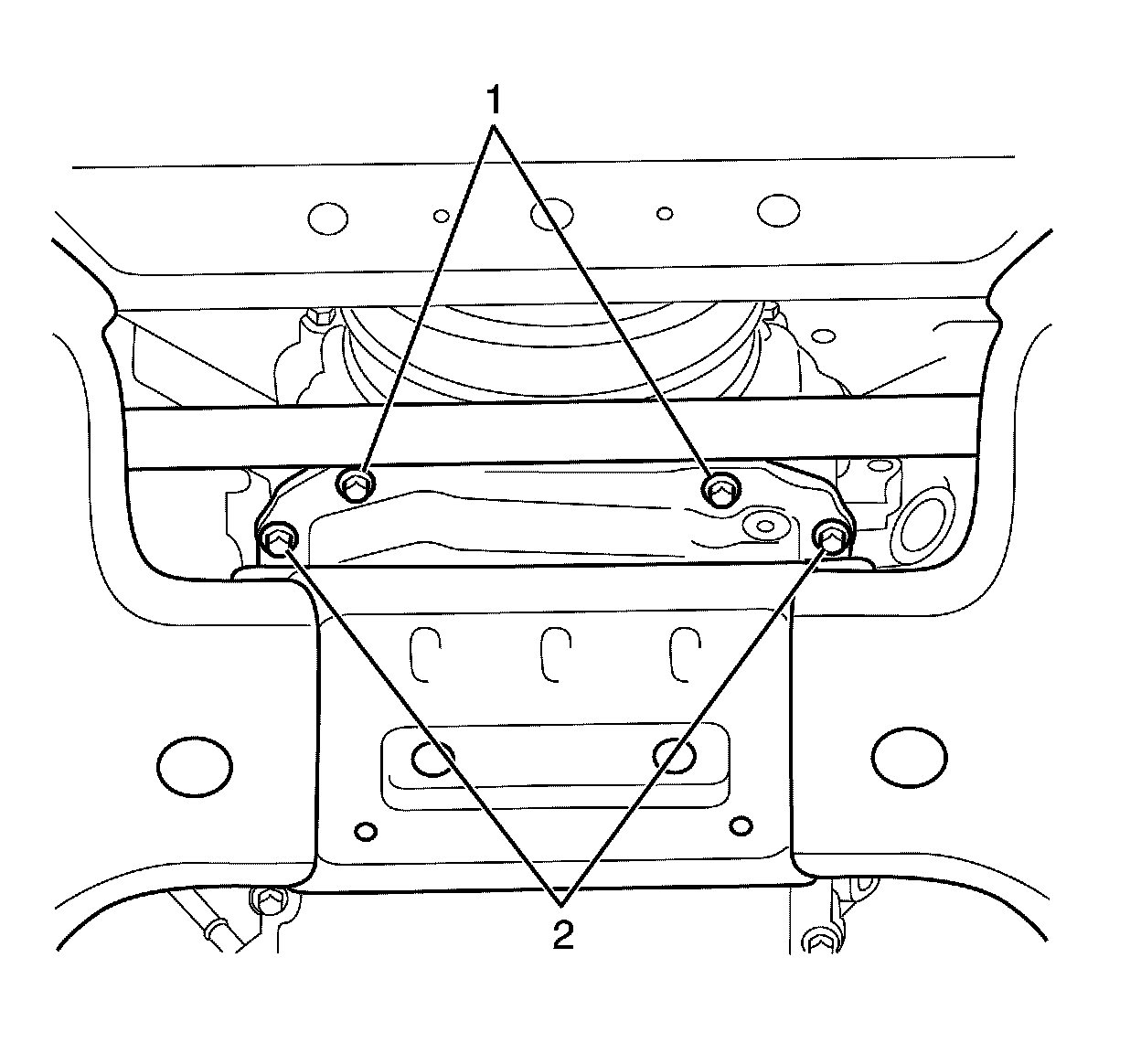 25. Remove the lower engine mount to crossmember retaining nut (1) from both engine mounts.