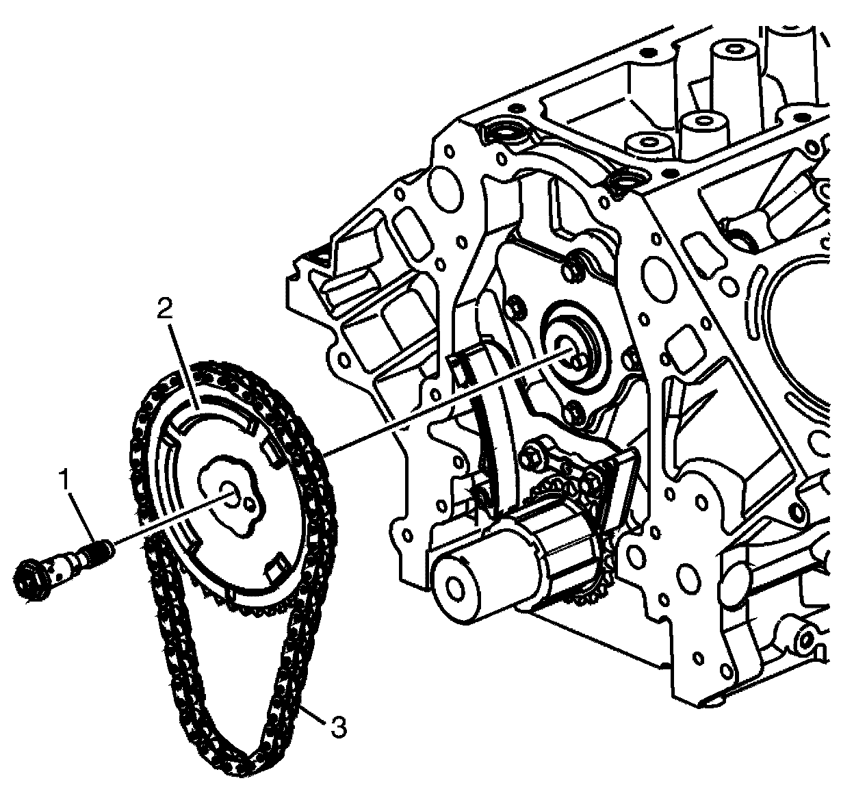 3. Remove the camshaft sprocket (2) and timing chain (3).
