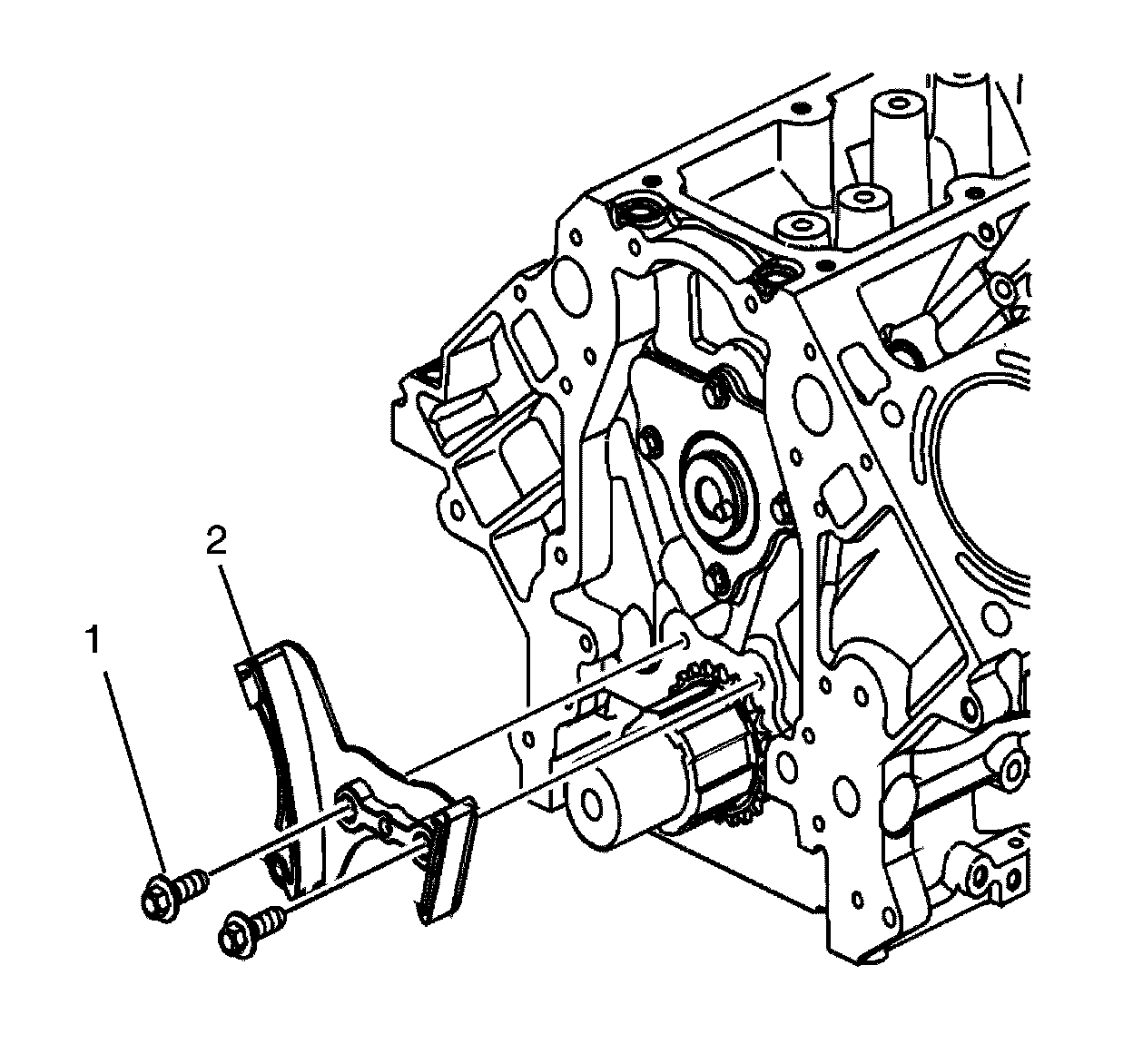 4. Remove the timing chain tension bolts (1) and tensioner (2).