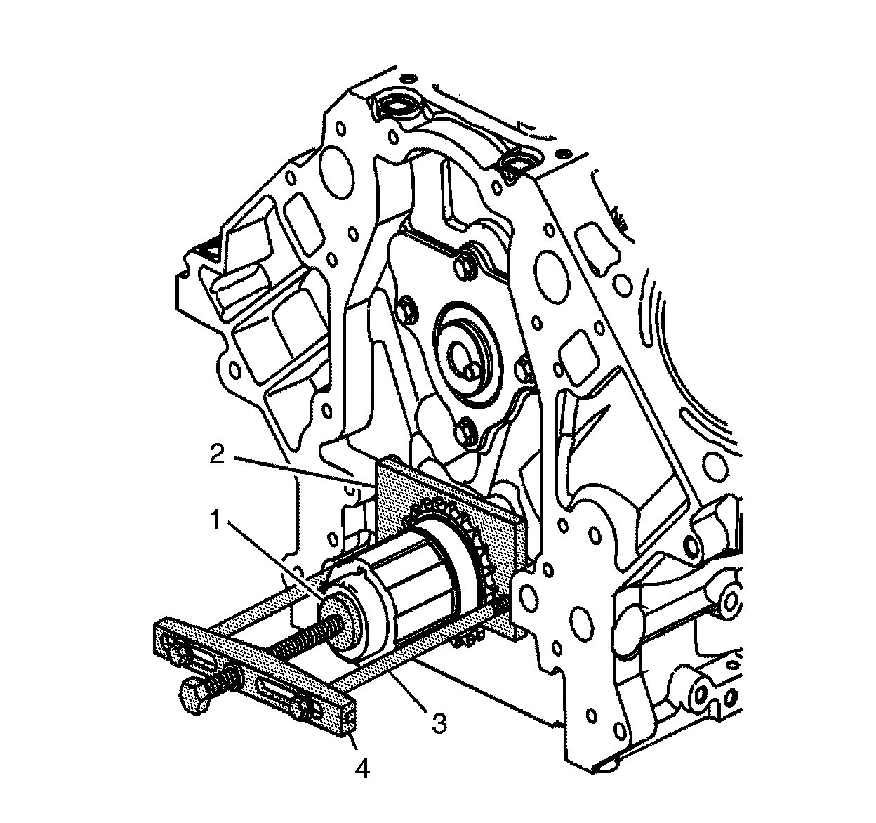 5. Using the J 41816-2 (1), the J 41558 (2), bolts (3) and the J 8433-1 1 (4) in order to remove the crankshaft sprocket.
