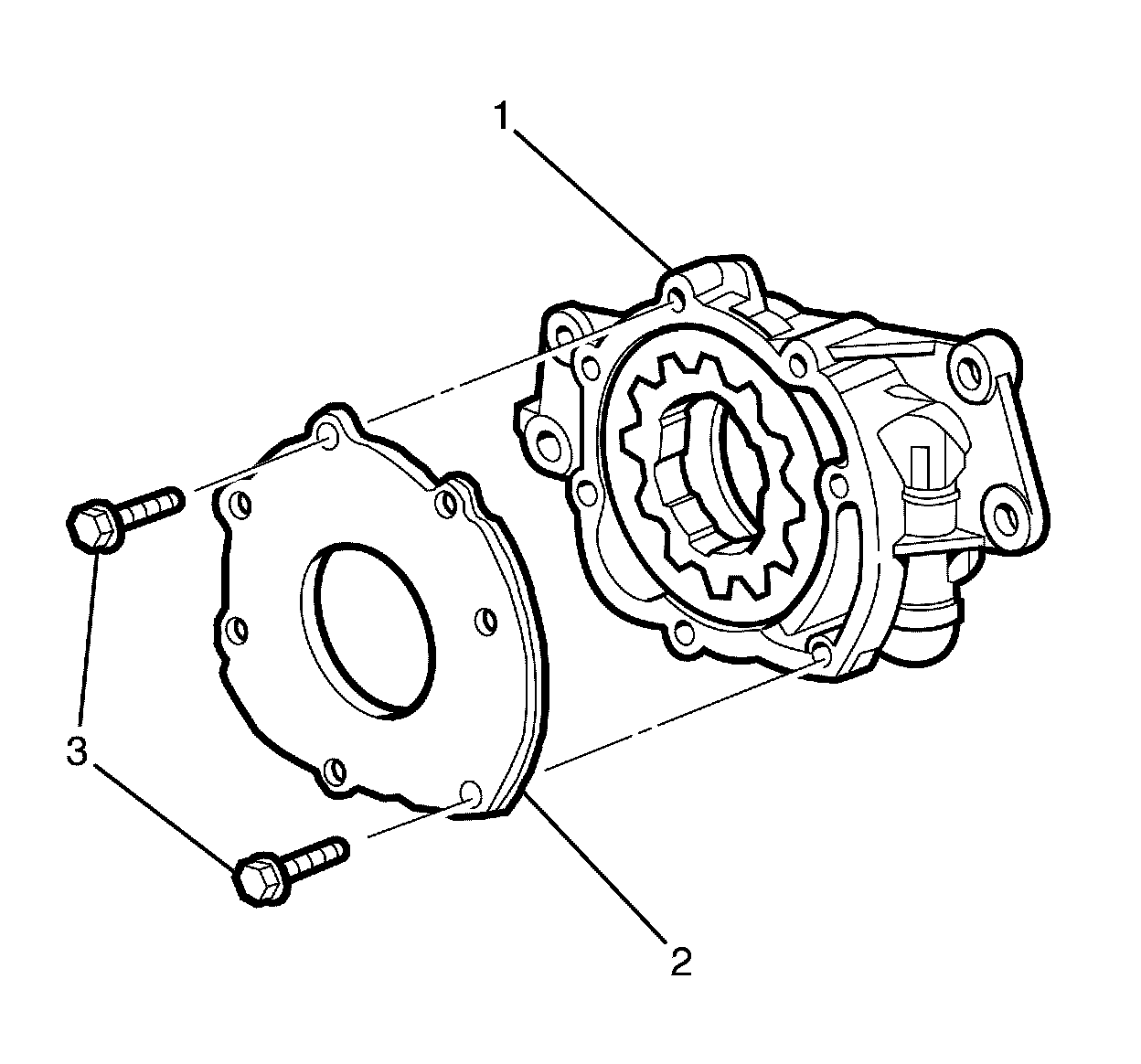 1. Remove the oil pump cover to oil pump housing retaining bolts (3).