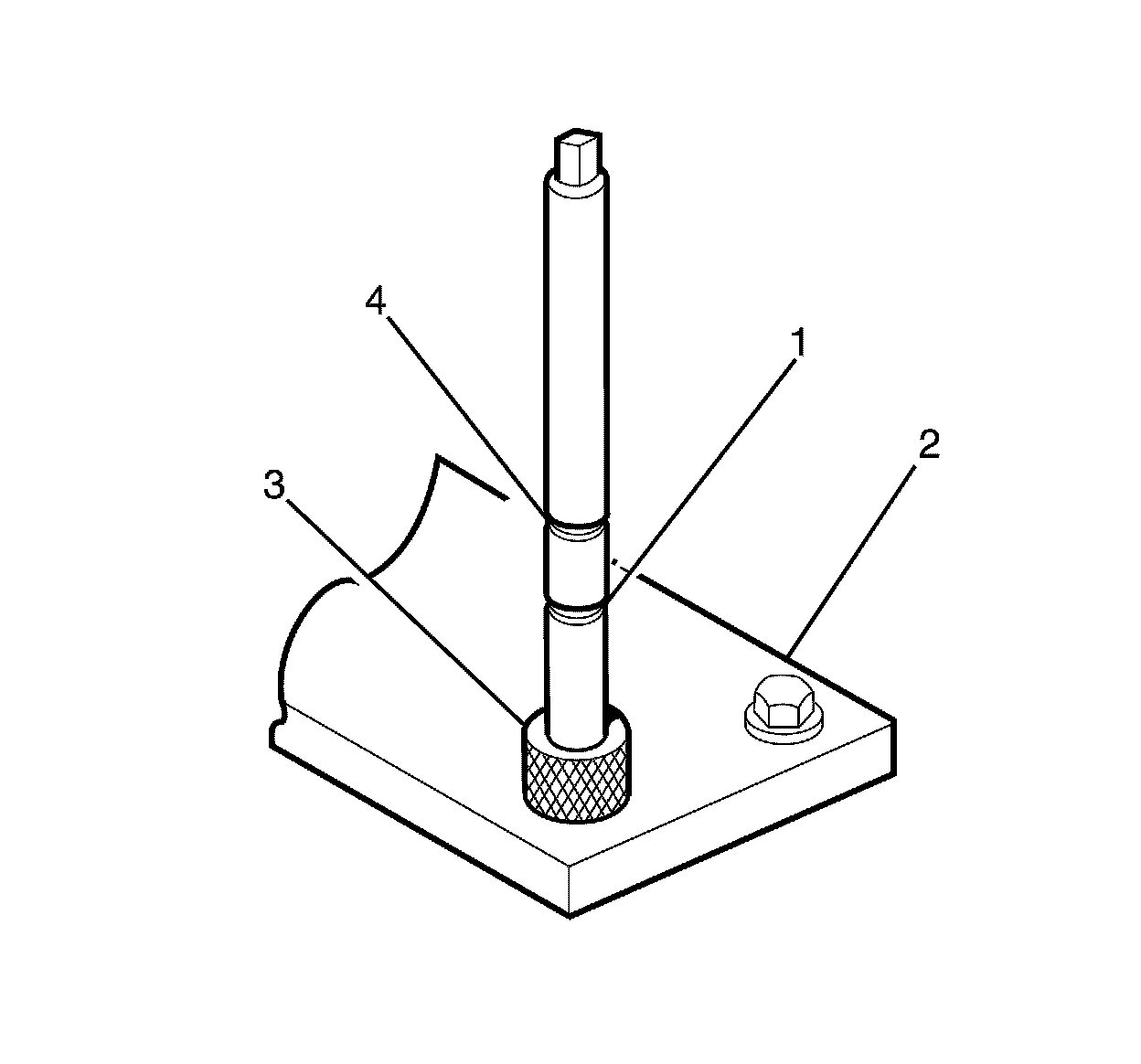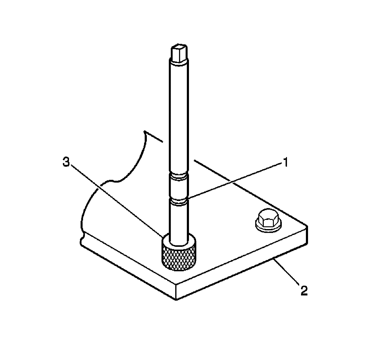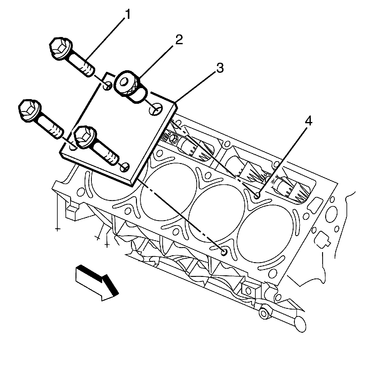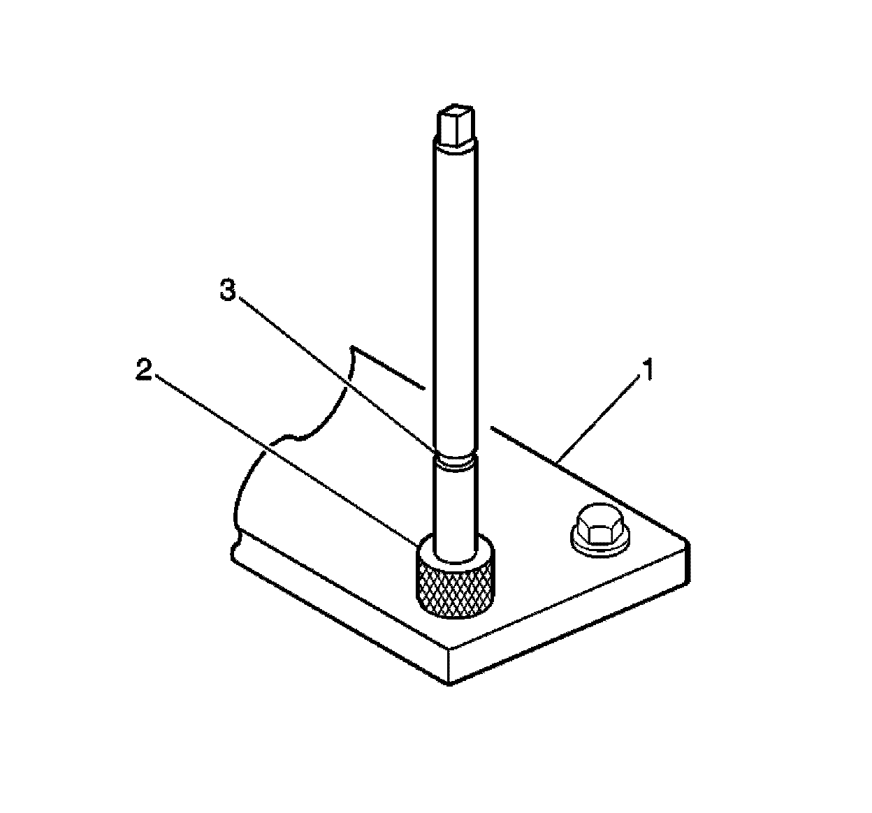 2. Install the fixture plate (3), bolts (1), and bushing (2) onto the engine block deck.