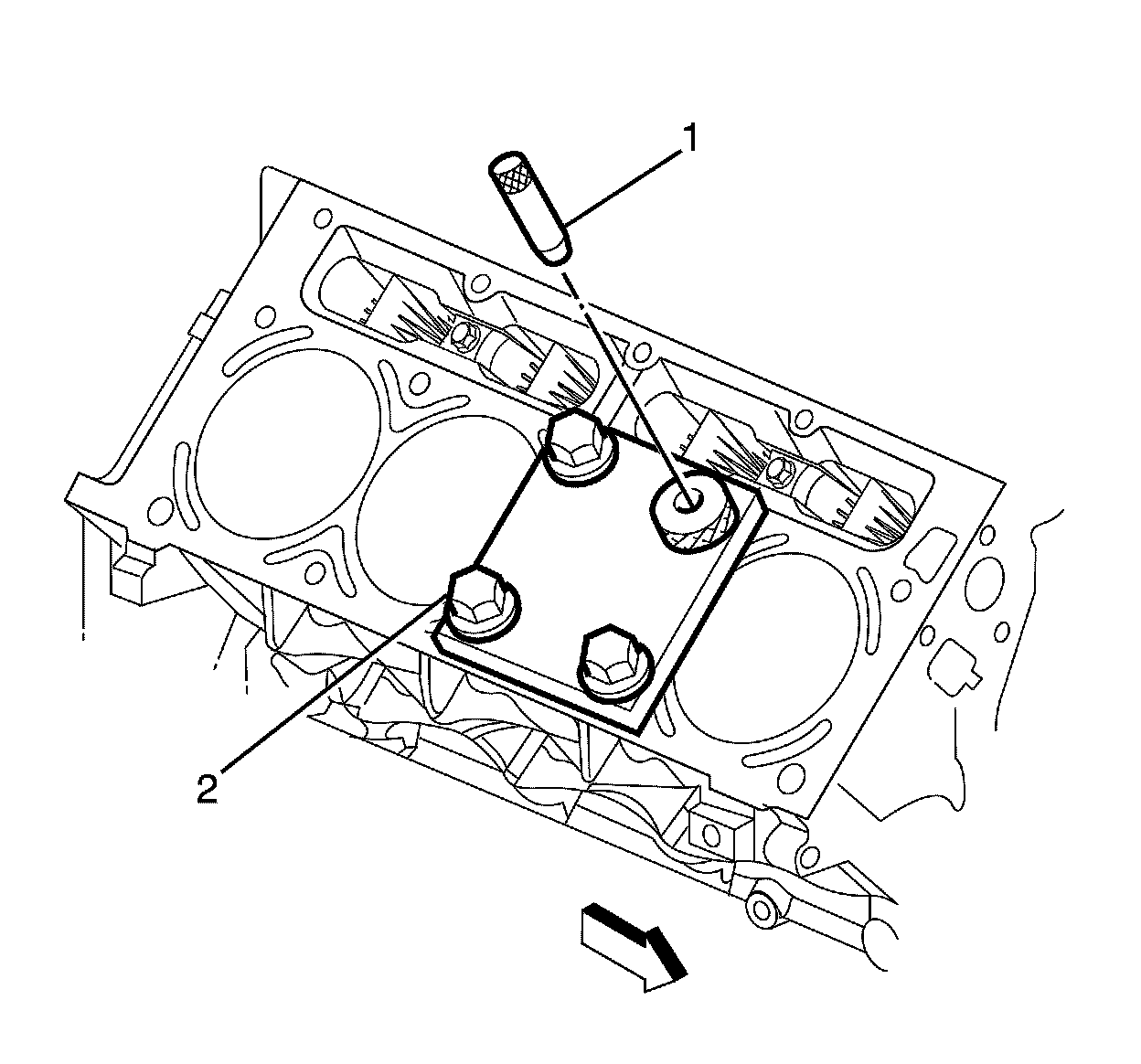 14. Inspect the insert (1) for correct installation (2) into the tapped hole.