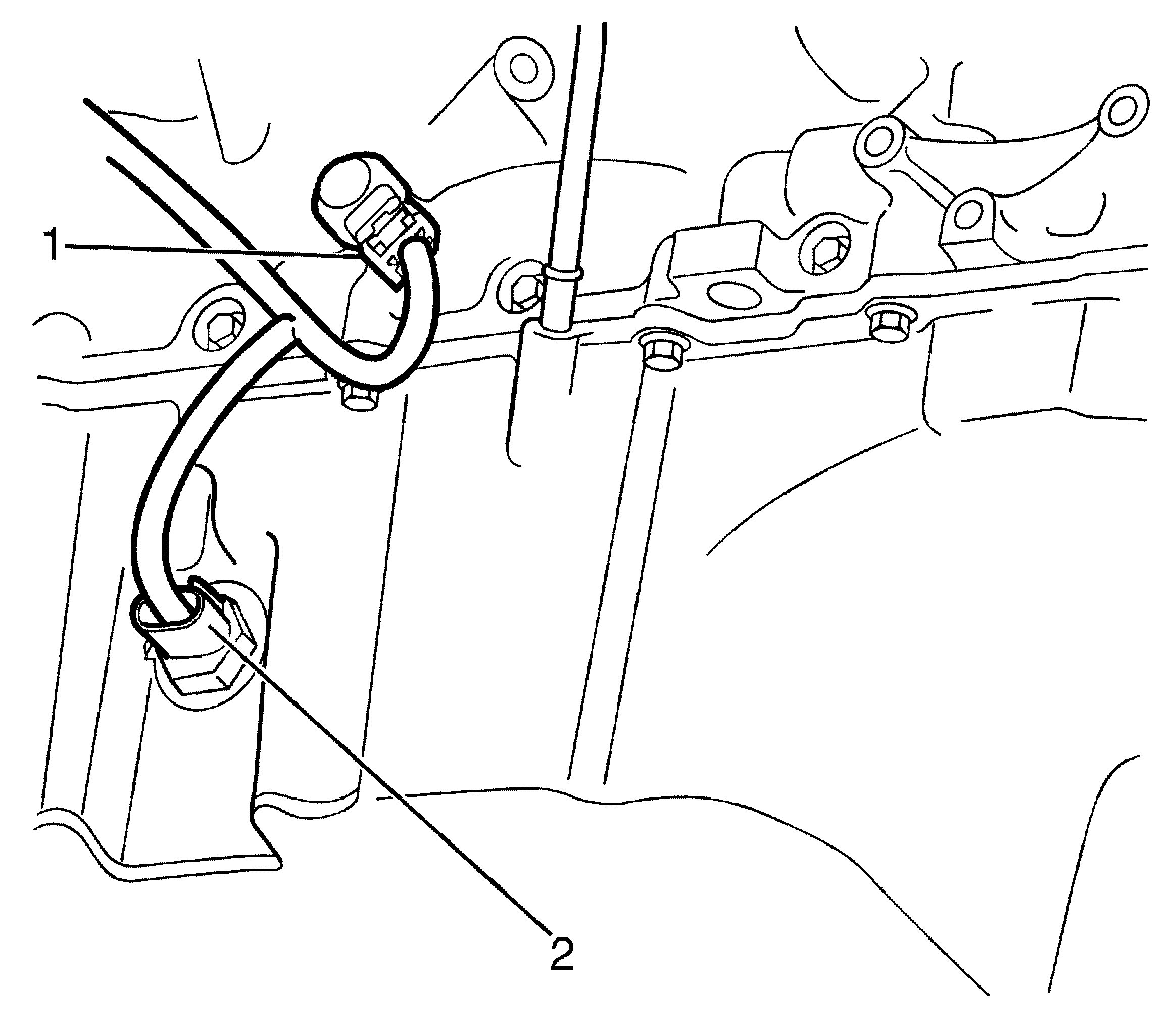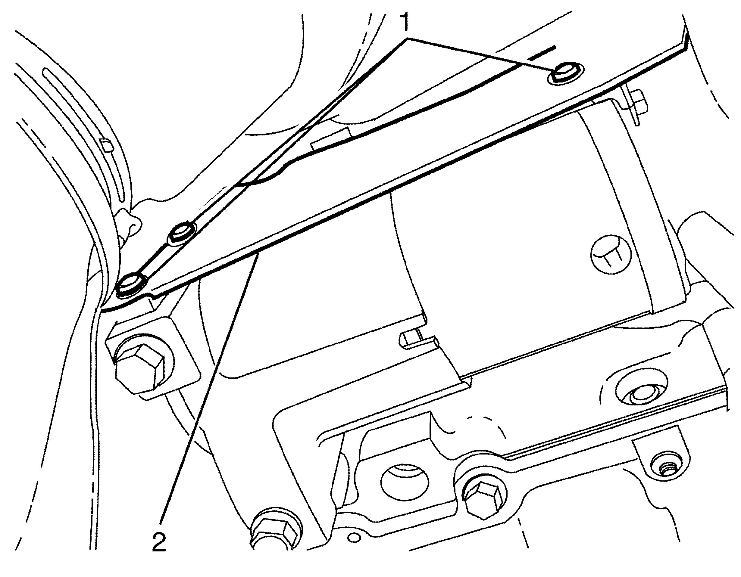 11. Attach the wiring harness retaining clip (2) to the engine lifting bracket (1).