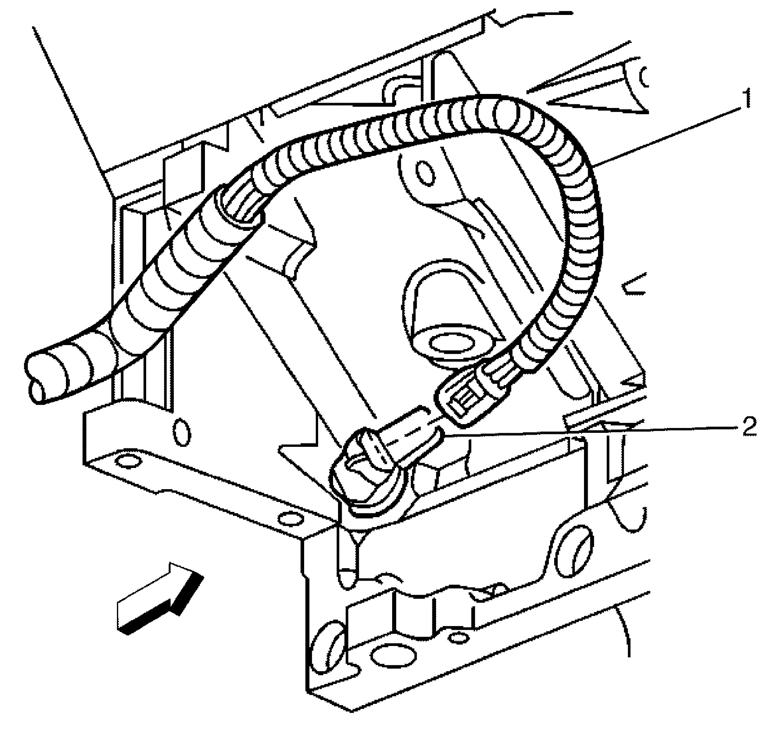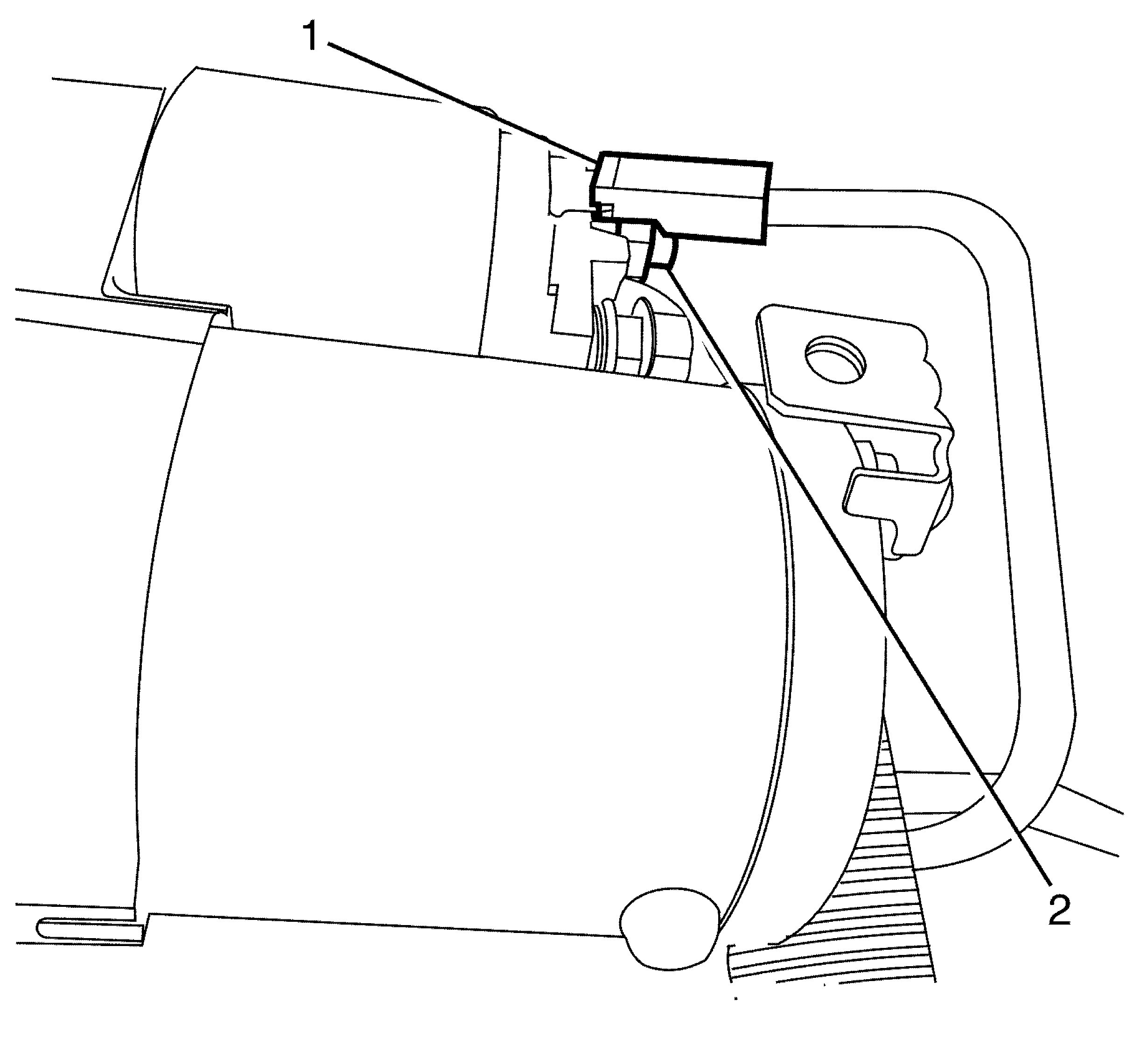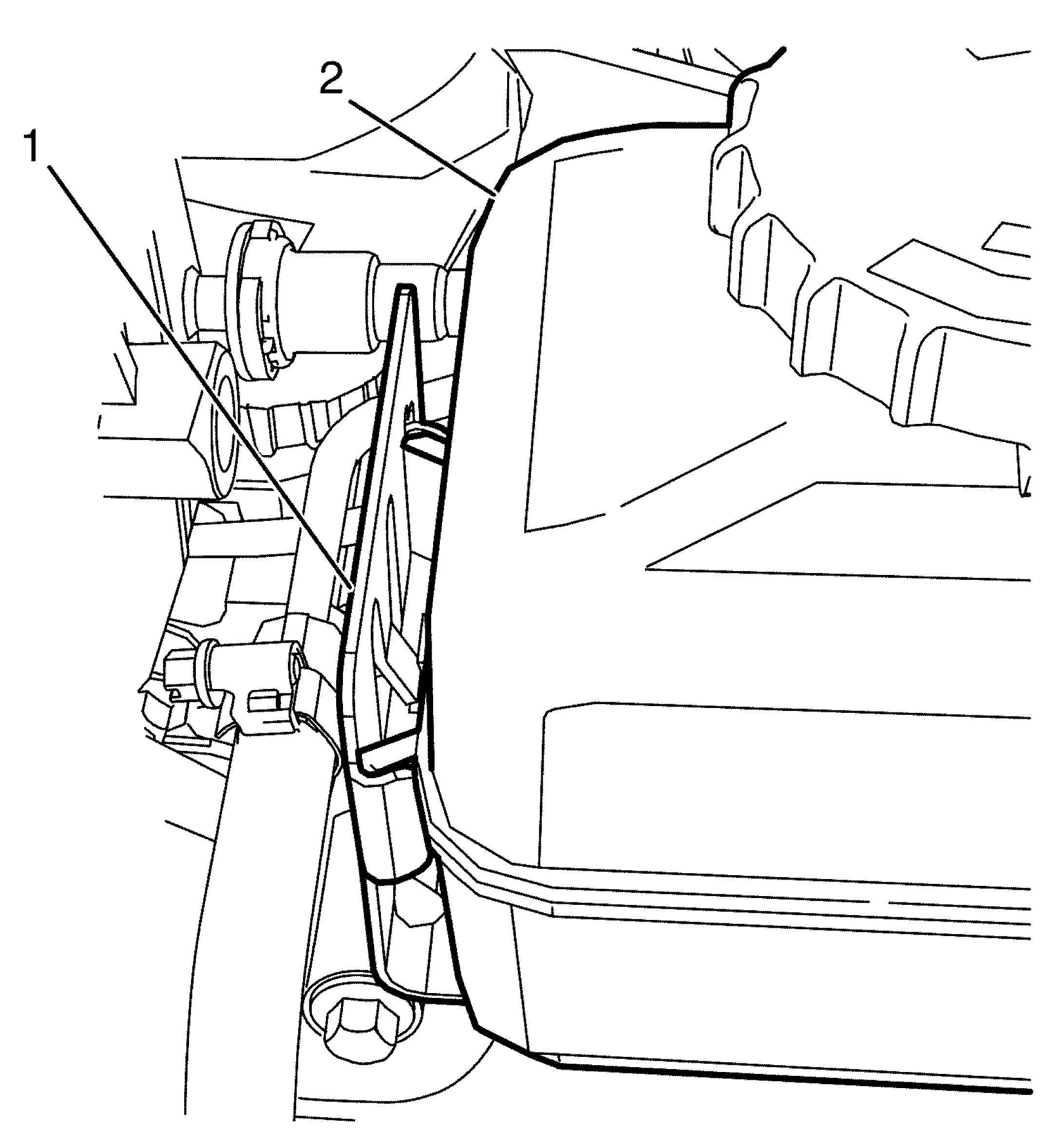 Important: Make sure the power steering reservoir (2) and the power steering reservoir bracket locking tang (1) are engaged to avoid an induced rattle condition.