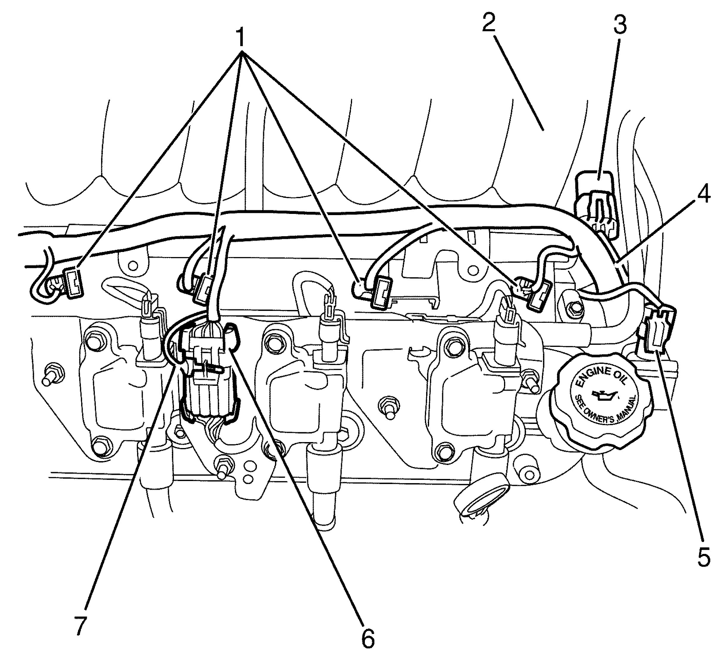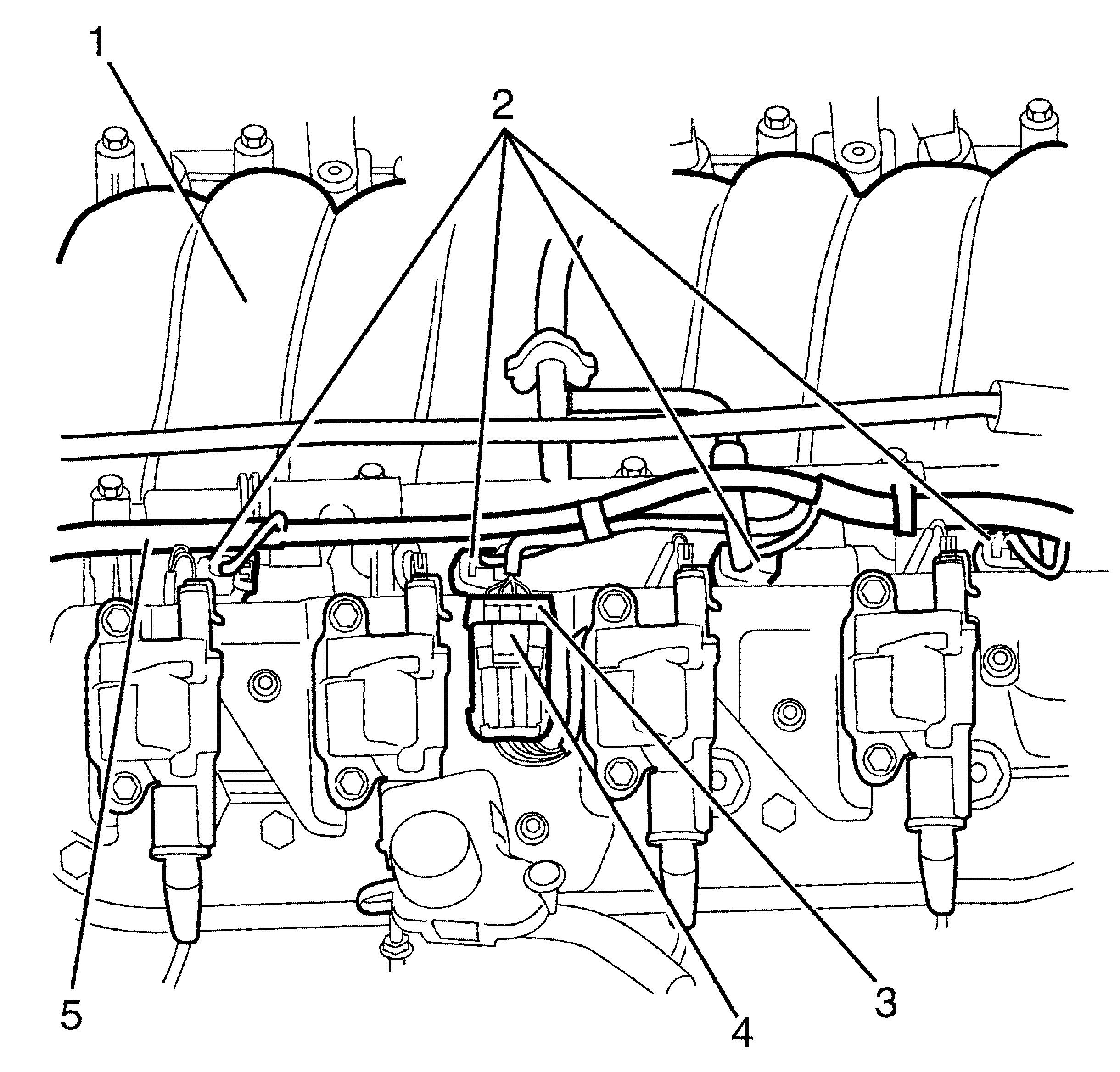 4. Position and secure the left side fuel injector wiring harness (5) away from the intake manifold (1).