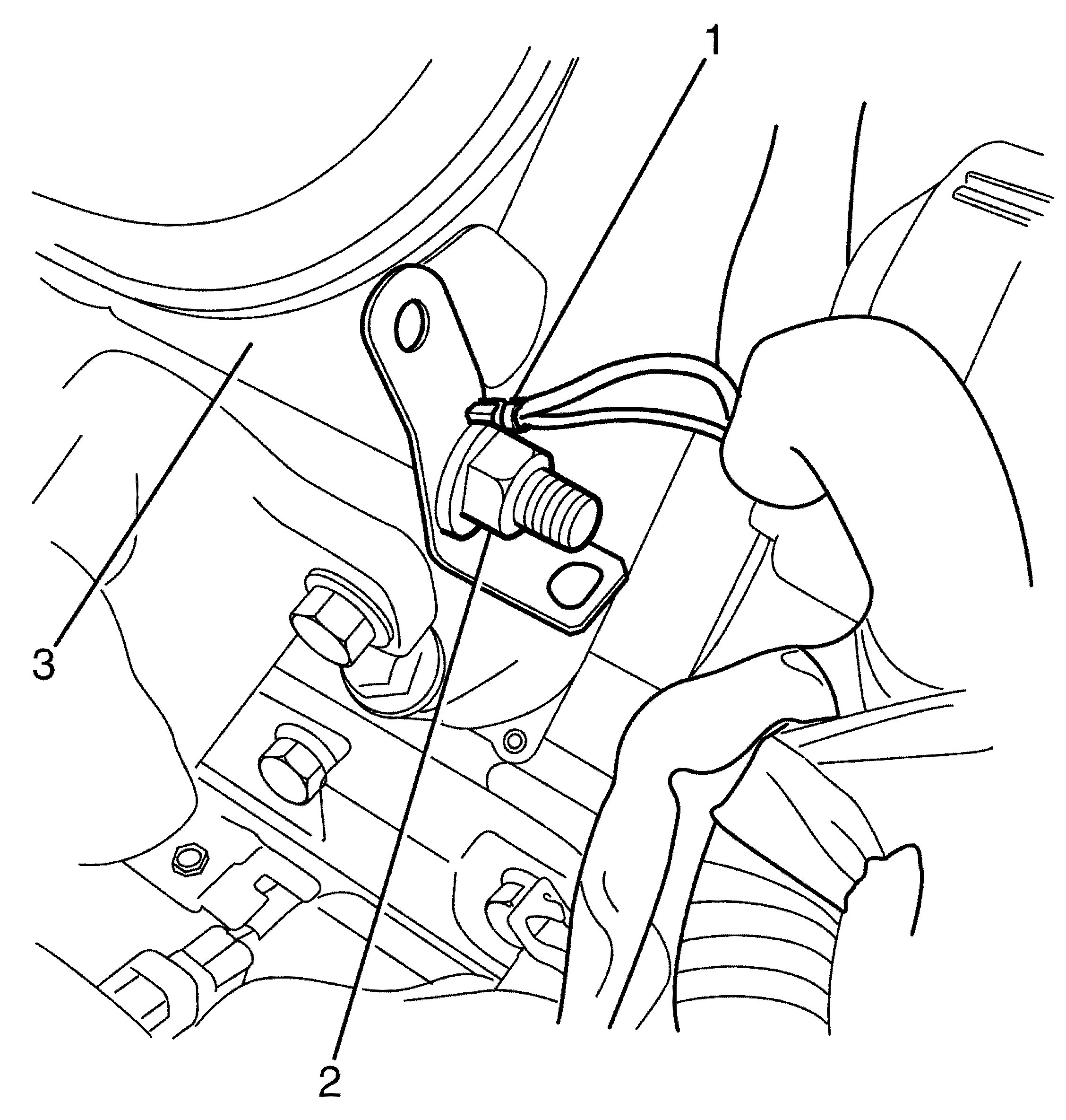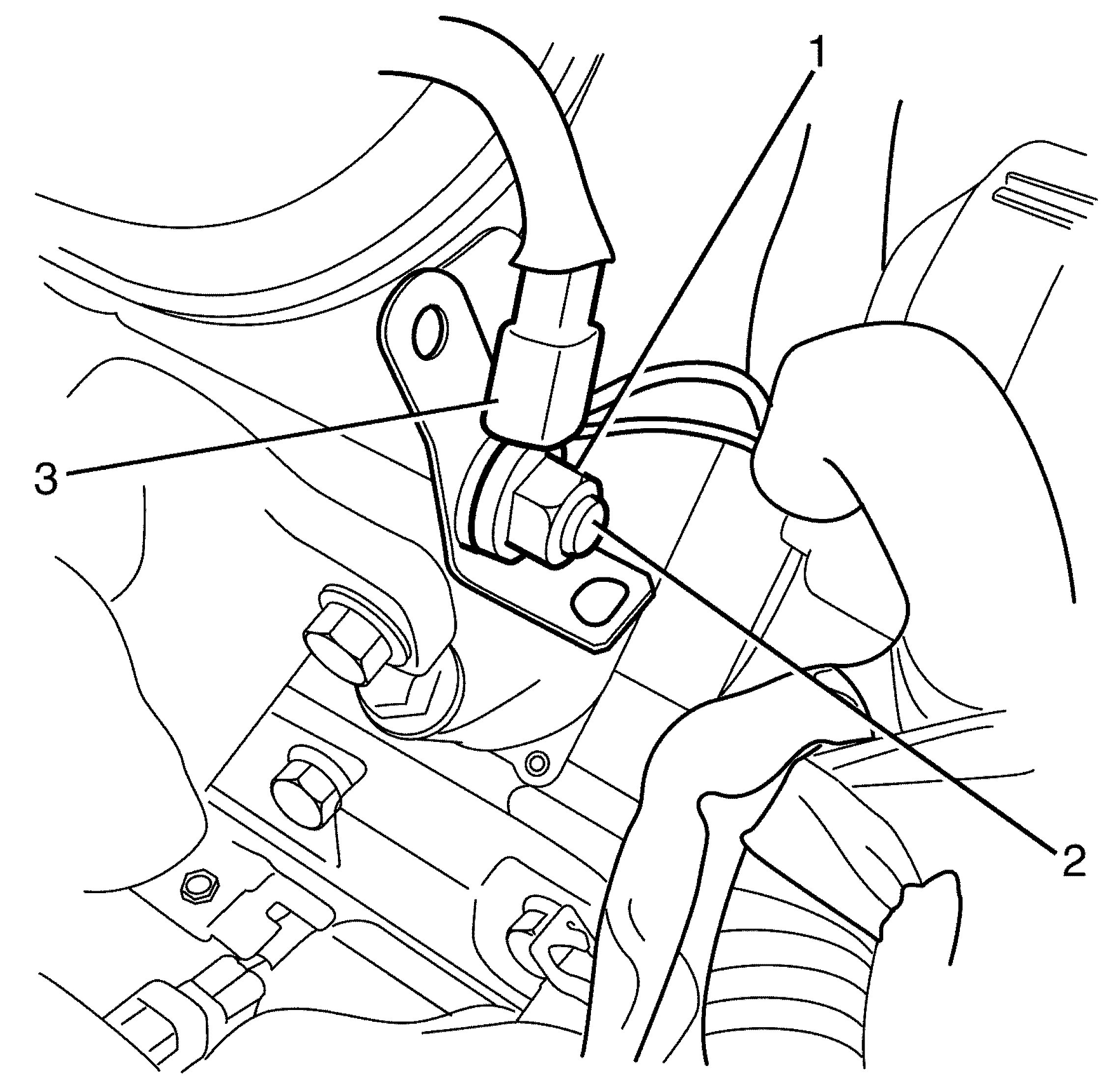18. Position the vehicle body ground cable (3) on the cylinder head stud (2).