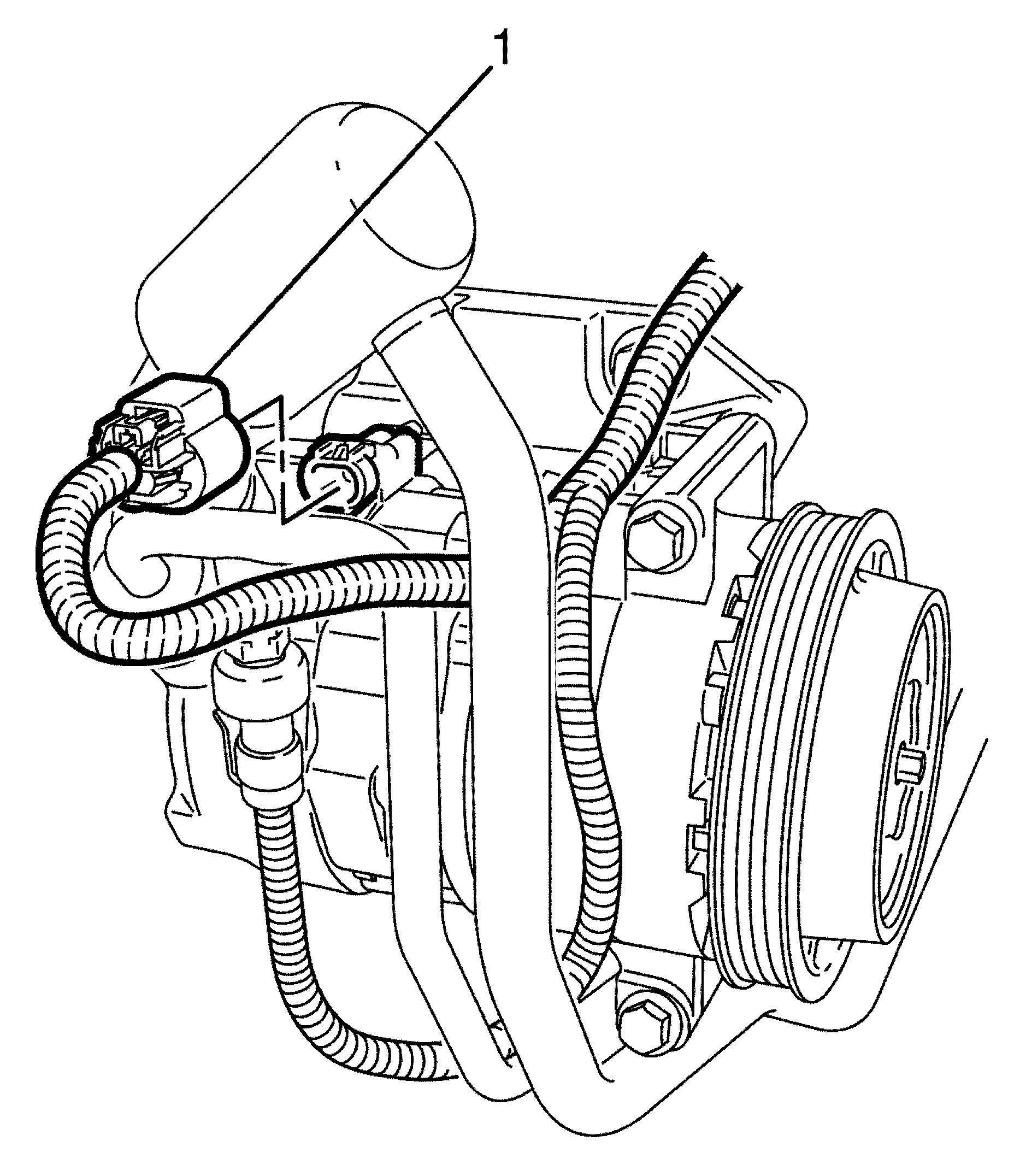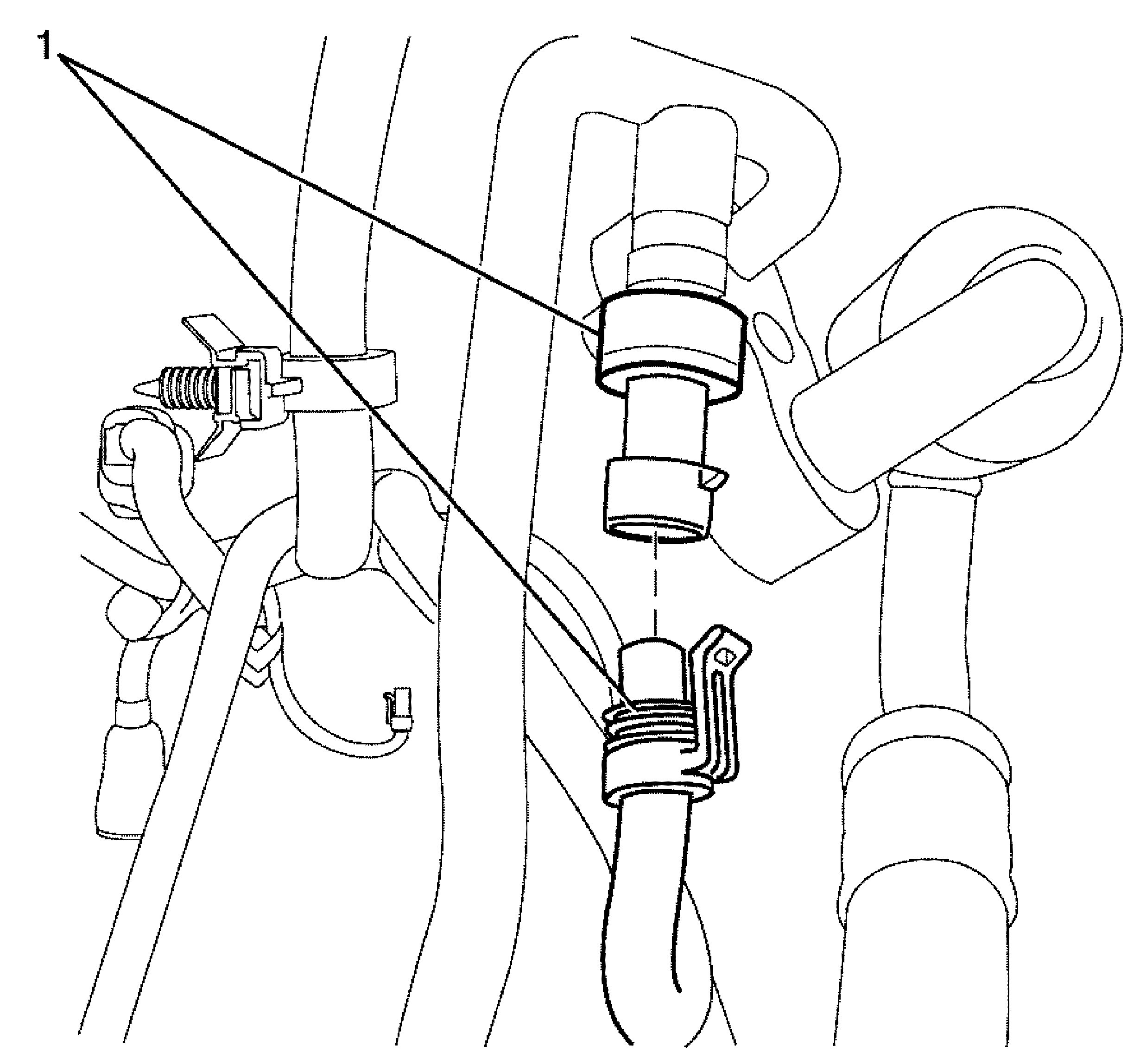 14. Connect the electrical connector to the A/C Refrigerant Pressure Sensor (1).