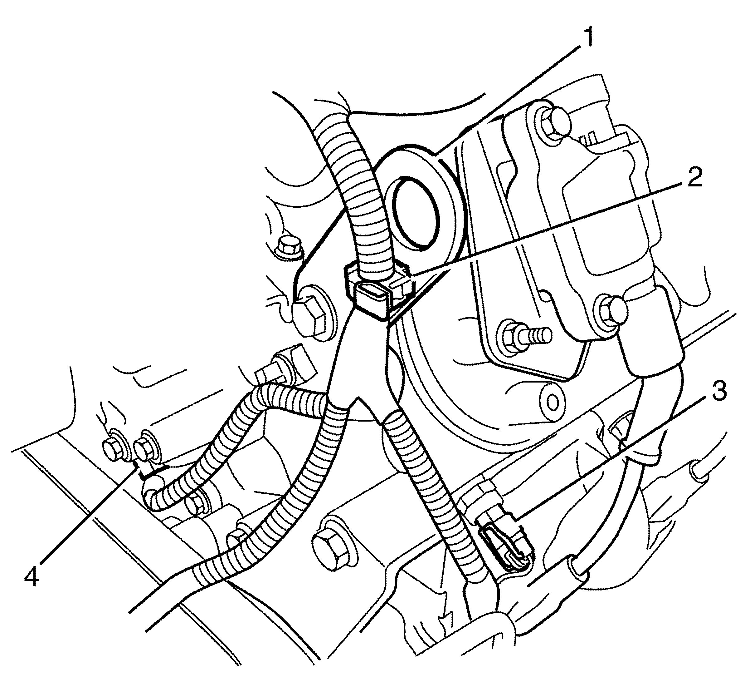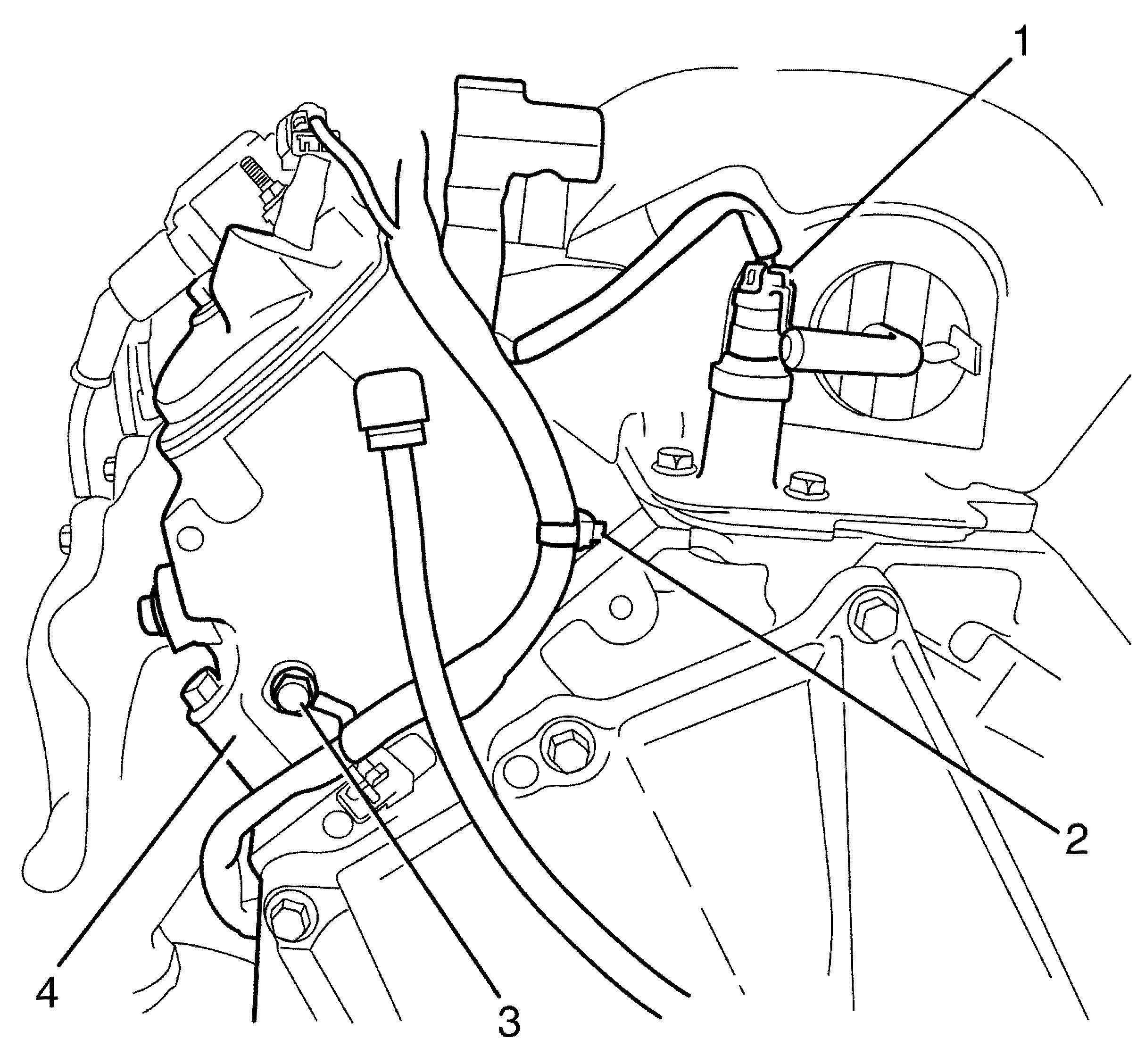 3. Attach the wiring harness assembly retaining clip (2) to the left side cylinder head (4).