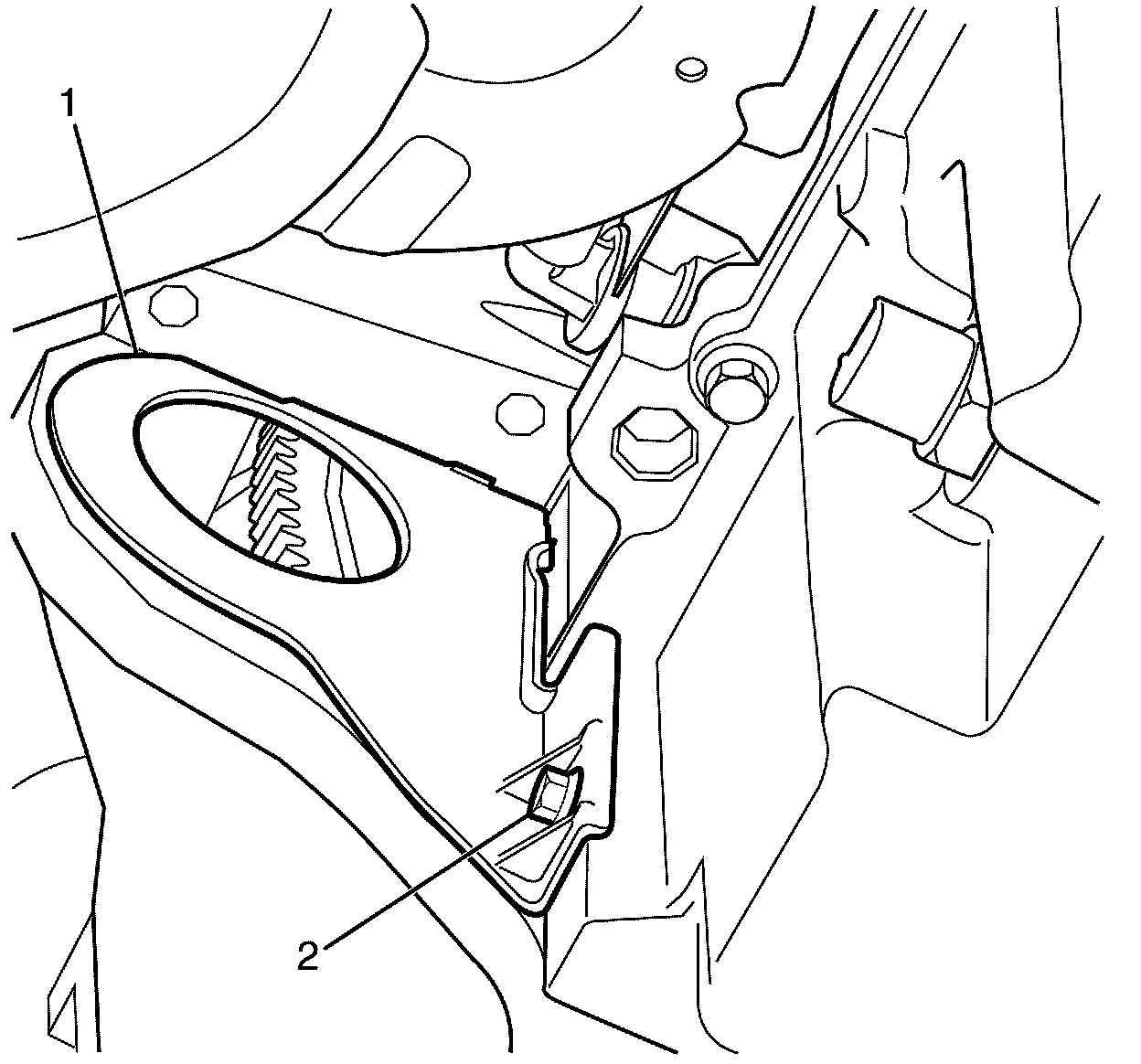 12. Install the right side close out cover to cylinder block retaining bolt (2).