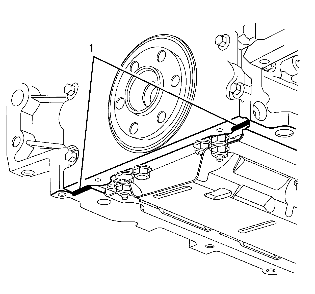 1. Apply a 5 mm (0.2 in) bead of sealant 20 mm (0.8 in) long to the engine block (1). Apply the sealant directly onto the tabs of the front cover gasket that protrude into the oil pan surface. Refer to Adhesives, Fluids, Lubricants, and Sealers (Specifications) .
