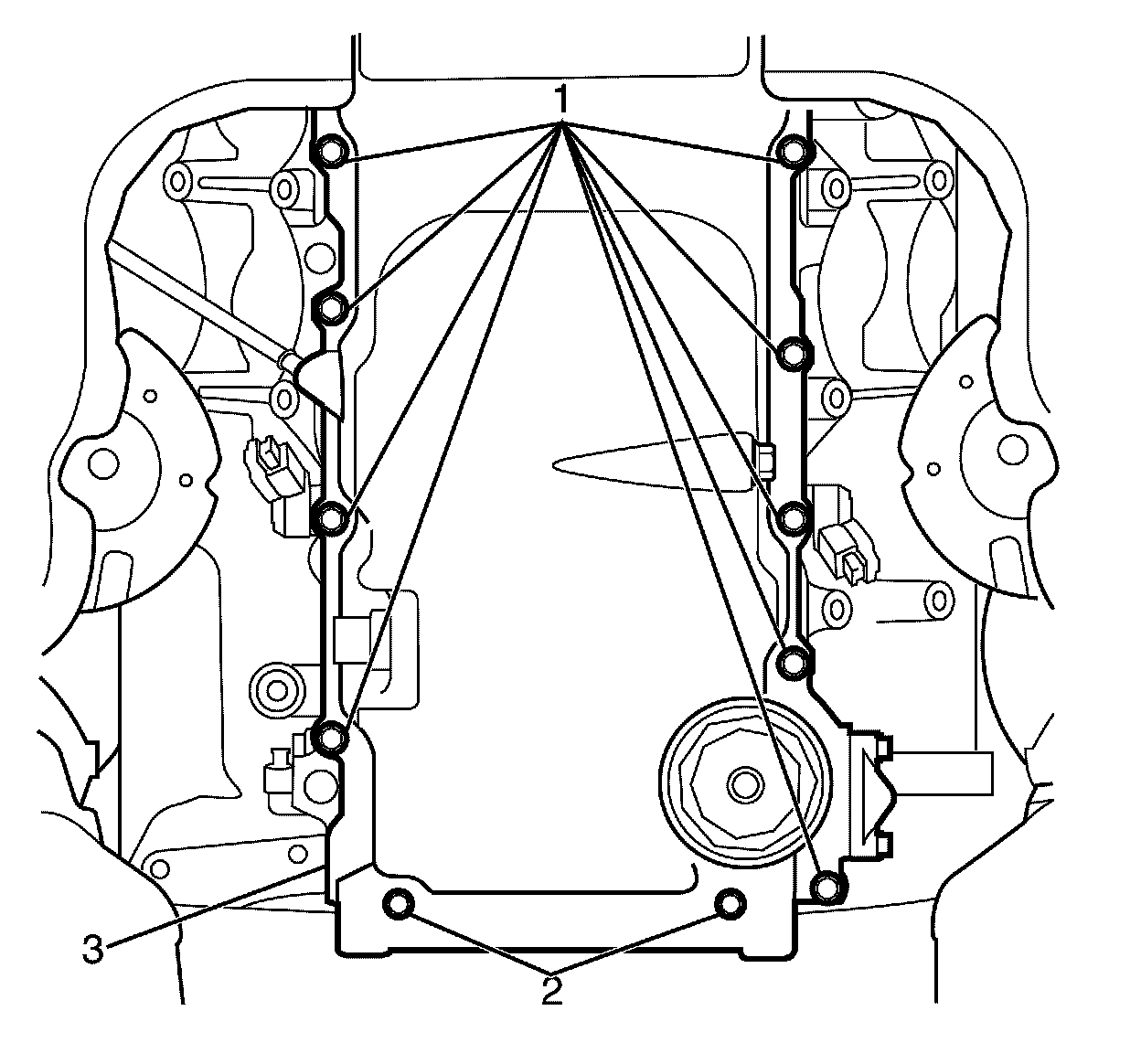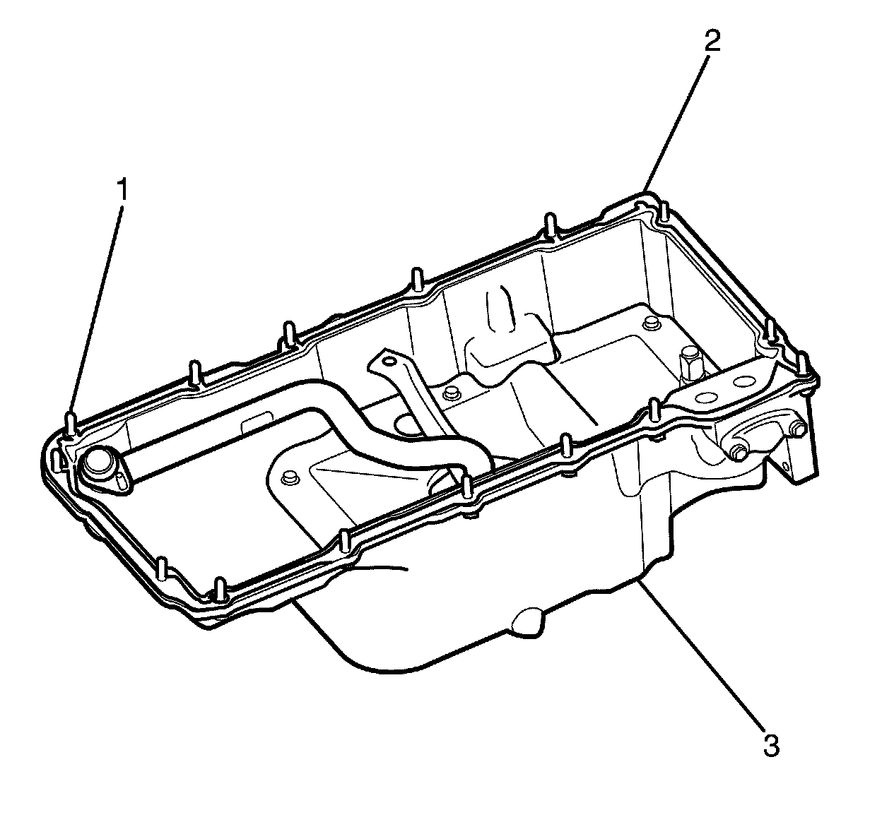 2. Install the oil pan retaining bolts (1) to the oil pan (3) and through the oil pan gasket (2).