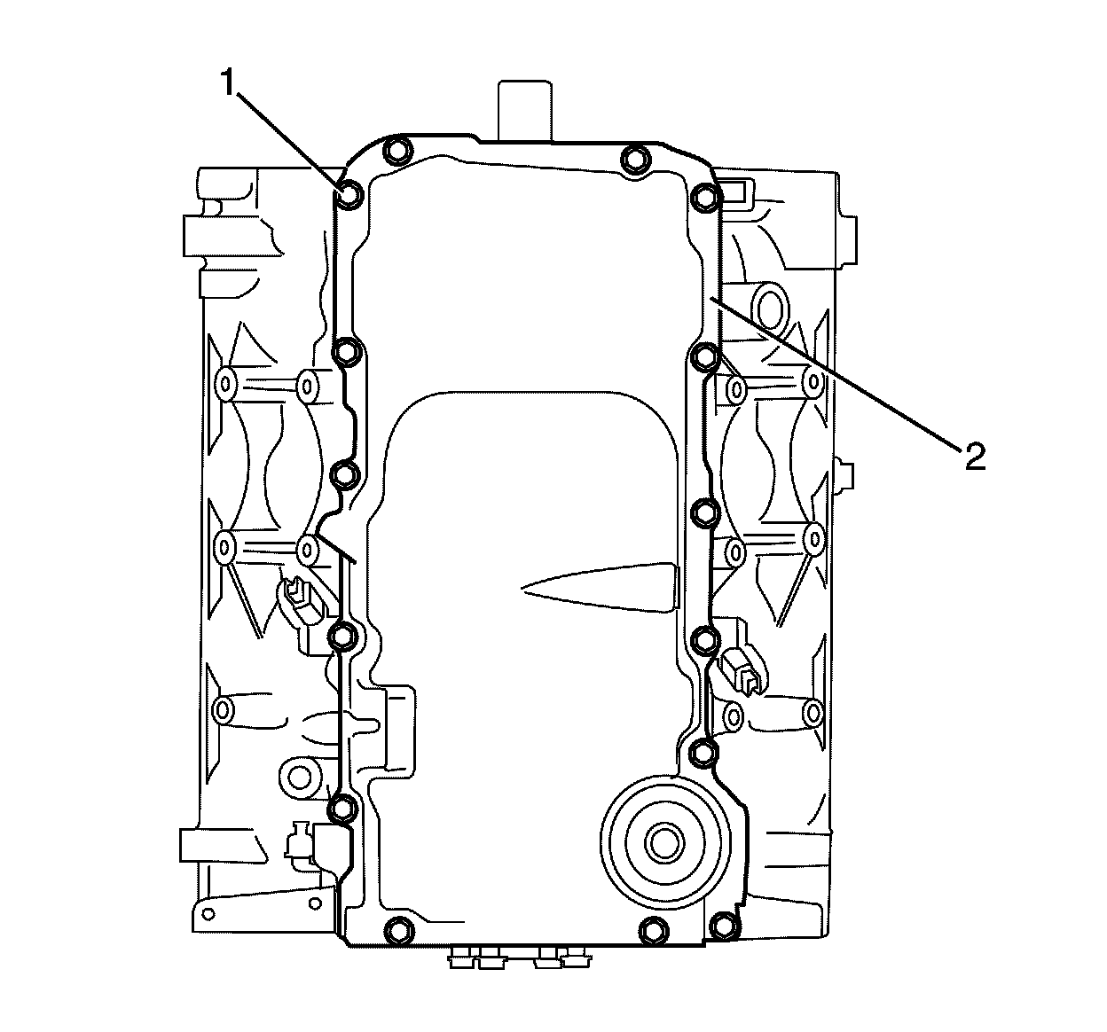 5. Tighten the oil pan to engine rear cover retaining bolts (2) finger tight. Do not over tighten.