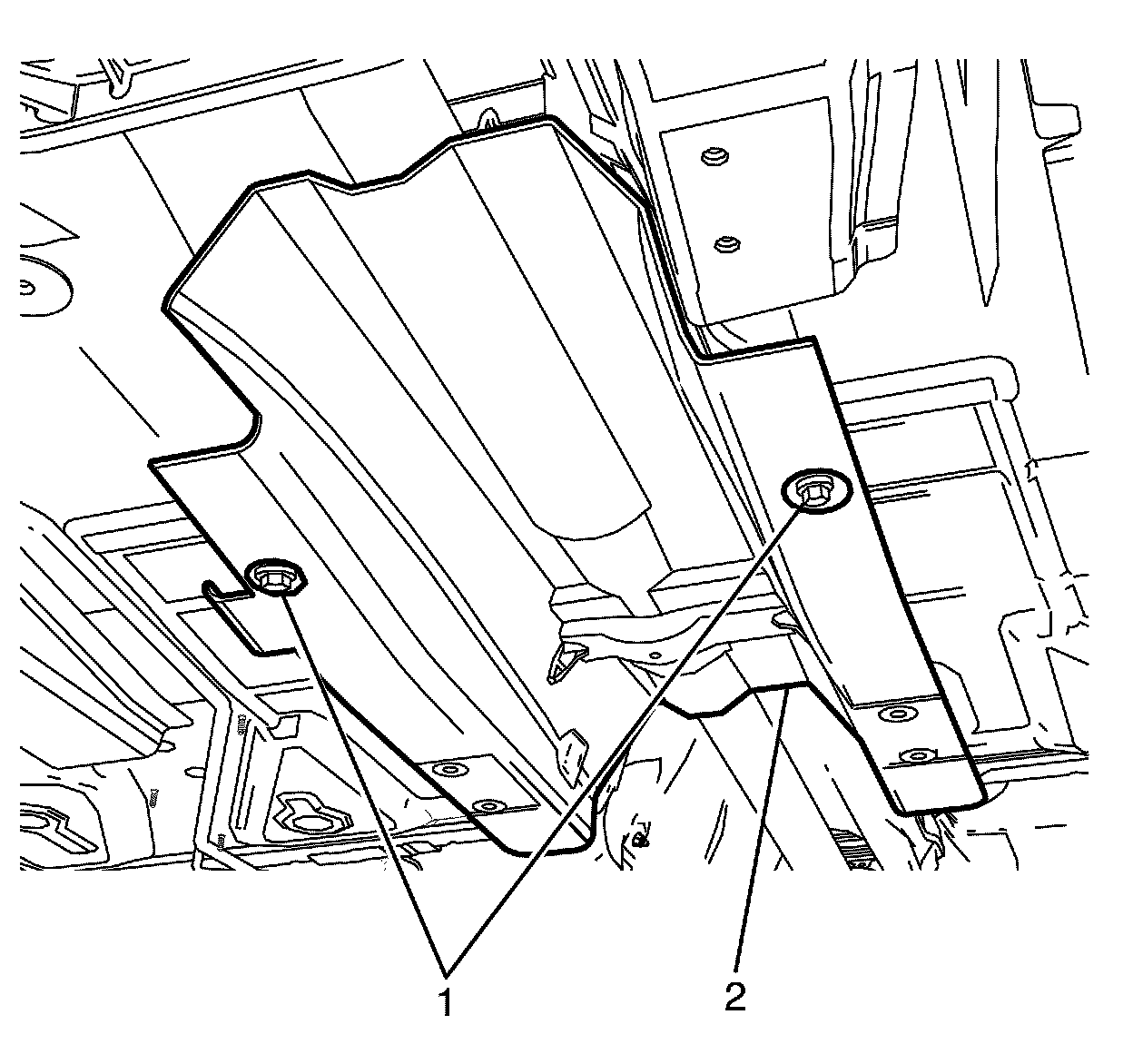 2. Install the centre exhaust heat shield to body retaining bolts (1).