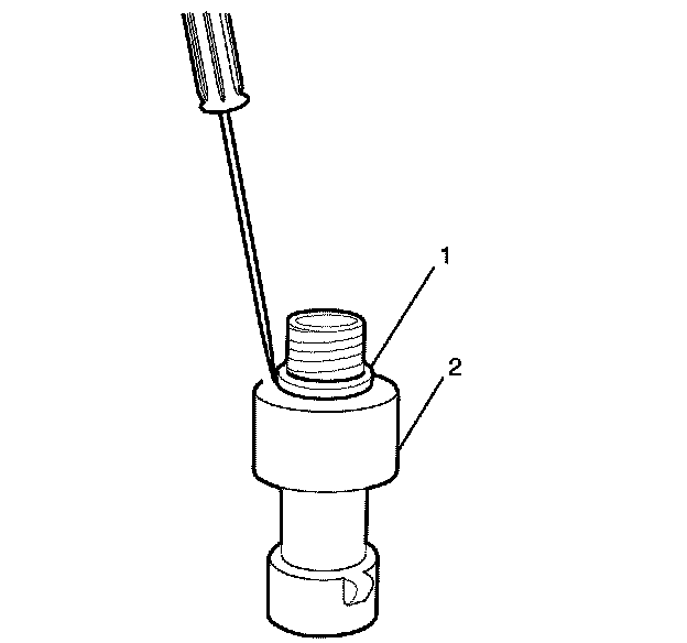 Important: Using a suitable tool, gently insert the end of the tool under the O-ring seal (1) and lift O-ring seal (1), evenly all the way around, off the A/C refrigerant component (2).