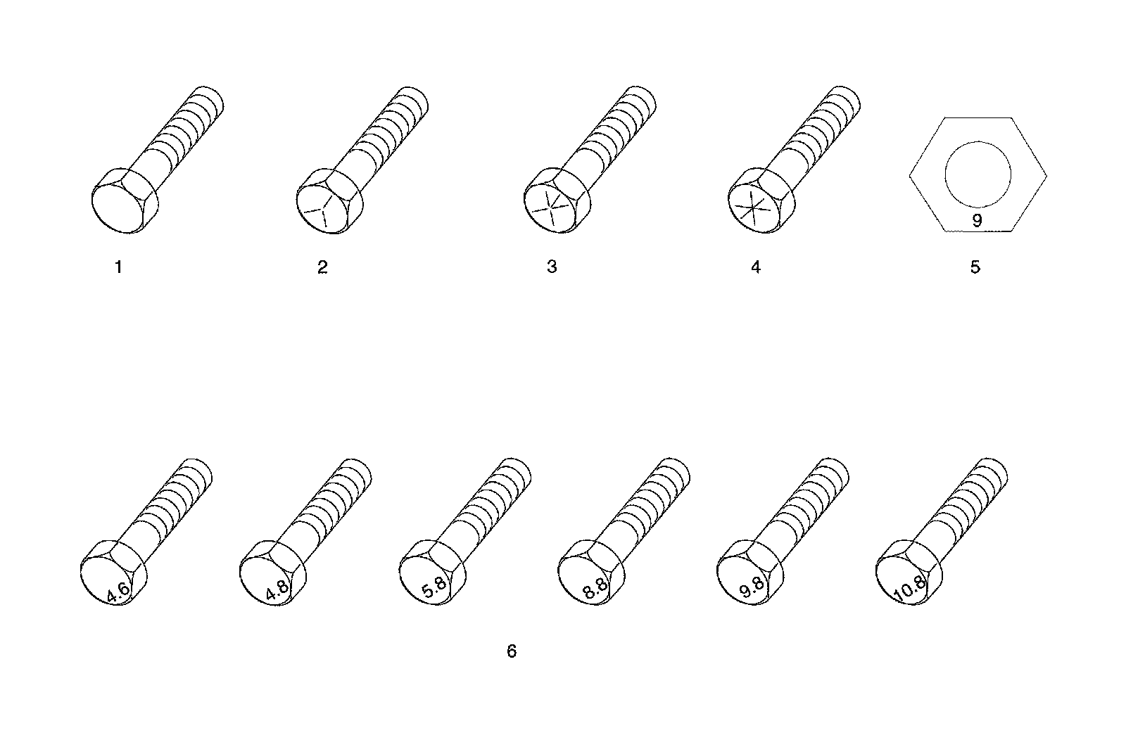 The most commonly used metric fastener strength property classes are 9.8 and 10.9. The class identification is embossed on the head of each bolt. The English, inch strength classes range from grade 2 to grade 8. Radial lines are embossed on the head of each bolt in order to identify the strength class. The number of lines on the head of the bolt is 2 lines less than the actual grade. For example, a grade 8 bolt will have 6 radial lines on the bolt head. Some metric nuts are marked with a single digit strength identification number on the nut face.