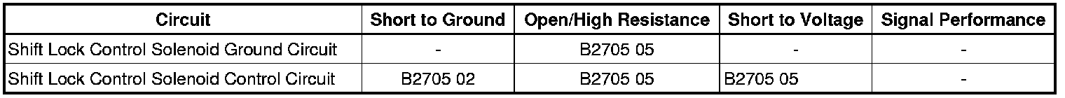 This DTC sets if the automatic transmission shift lock control solenoid control circuit is open or shorted to voltage.