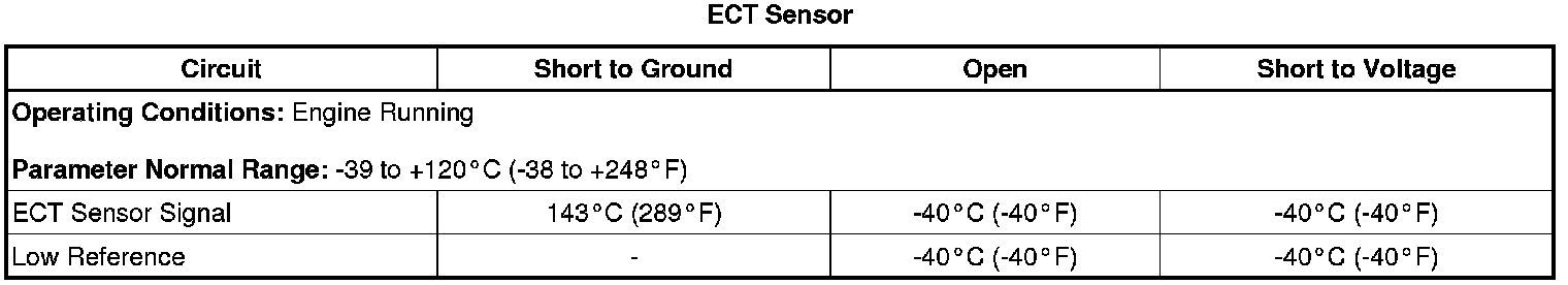 The ECM detects that the ECT is colder than -39°C (-38°F) for greater than 4 seconds.