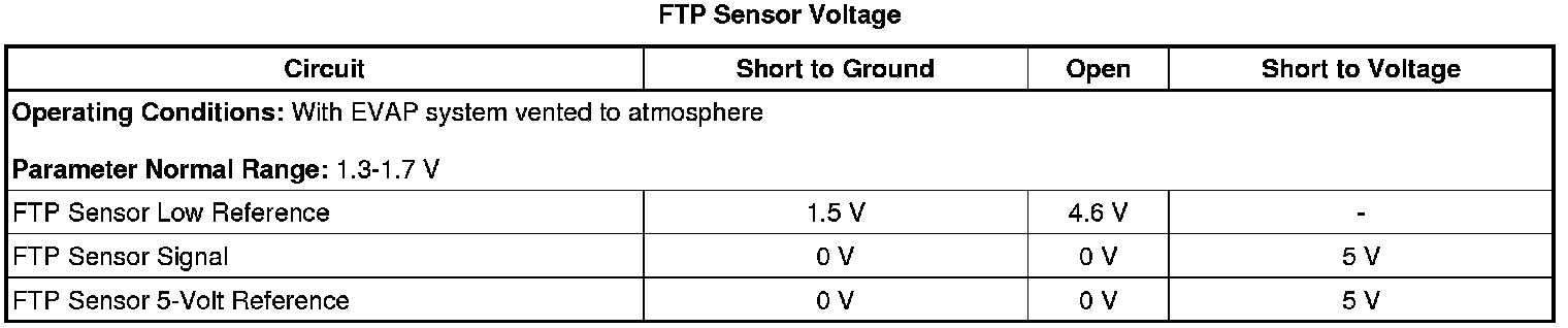 Ignition ON, observe the scan tool fuel tank pressure (FTP) sensor parameter. The reading should be between 1.3-1.7 volts with the fuel cap removed, and change with fuel tank pressure. Increasing pressure causes decreasing voltage, decreasing pressure causes increasing voltage.