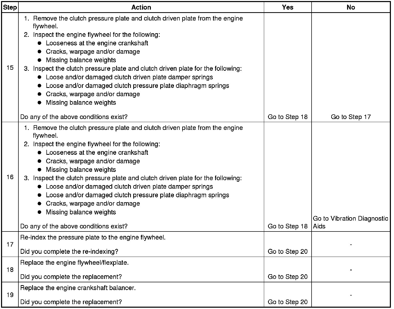 17. Re-indexing the pressure plate to the engine flywheel alters the balance relationship between the pressure plate/flywheel assembly and the rear of the engine.