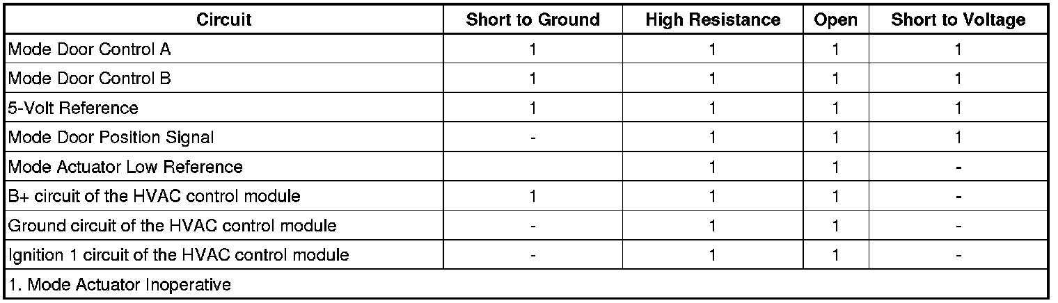The Mode actuator is a 5-wire bi-directional electric motor that incorporate a feedback potentiometer. Low reference, 5-volt reference, position signal, and 2 control circuits enable the actuators to operate. The control circuits use either a 0 or 12-volt value to coordinate the actuator movement. When the actuator is at rest, both control circuits have a value of 0 volts. In order to move the actuator, the HVAC control module grounds one of the control circuits while providing the other with 12 volts. The HVAC control module reverses the polarity of the control circuits to move the actuator in the opposite direction. When the actuator shaft rotates, the potentiometer's adjustable contact changes the door position signal between 0-5 volts.