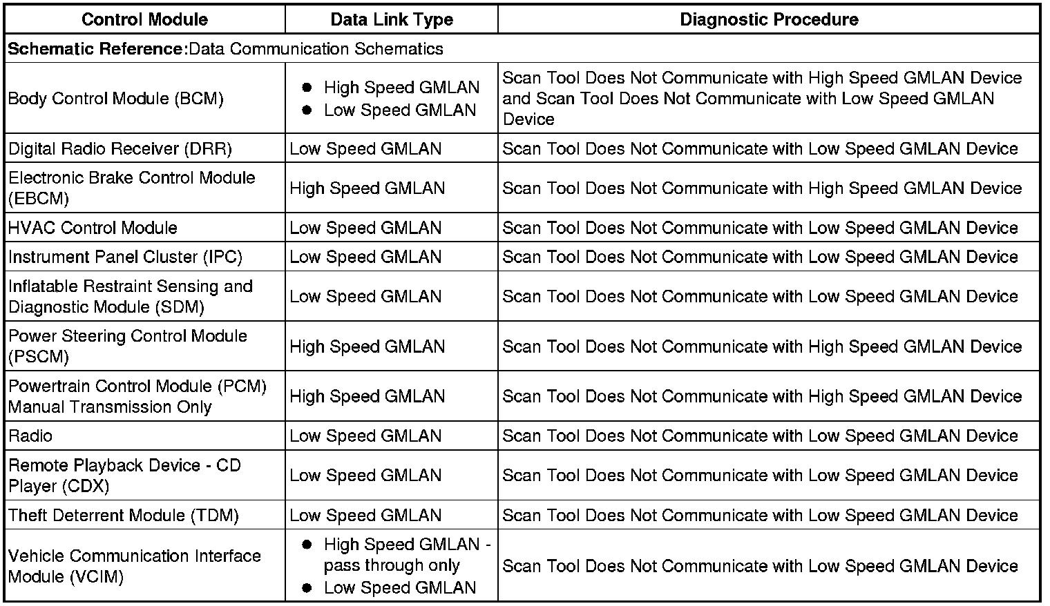 This table identifies which serial data link that a particular module uses for in-vehicle data transmission. Some modules may use more than one data link to communicate. Some modules may have multiple communication circuits passing through them without actively communicating on that data link. This table is used to assist in correcting a communication malfunction. For the description and operation of these serial data communication circuits, refer to Data Link Communications Description and Operation (Description and Operation) .