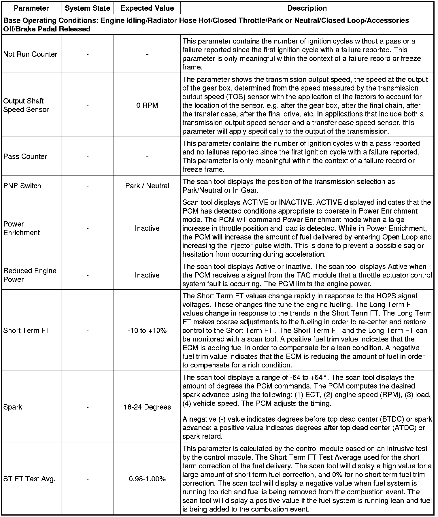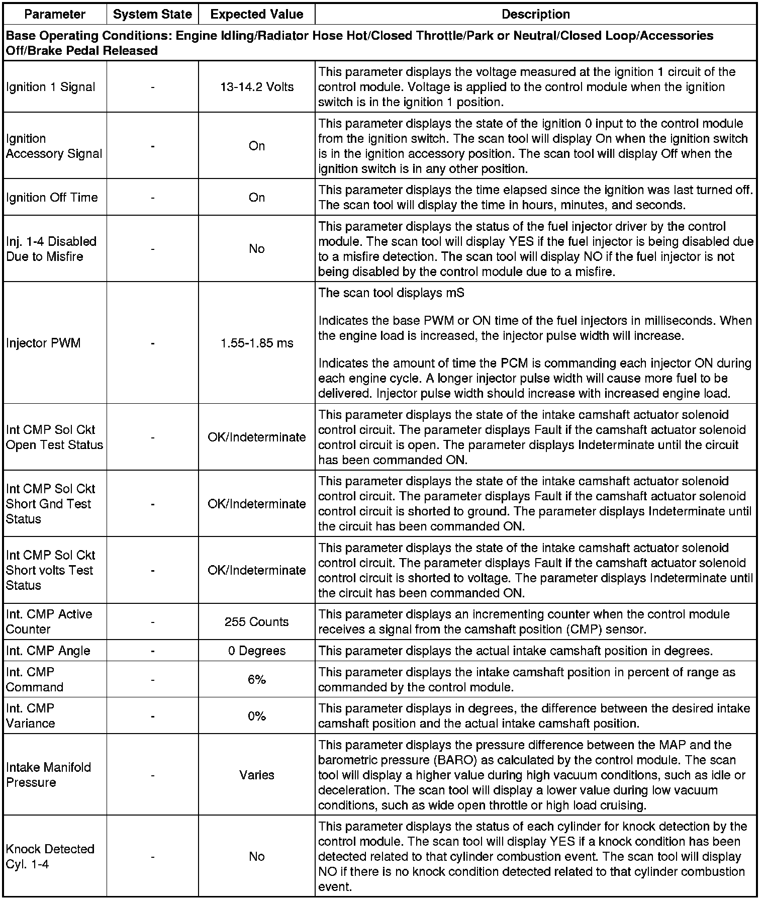 Only the parameters listed below are referenced in this service manual for use in diagnosis. If all values are within the typical range described below, refer to Symptoms - Engine Controls (- Symptoms - Engine Controls) for the 2.4L engine for diagnosis.