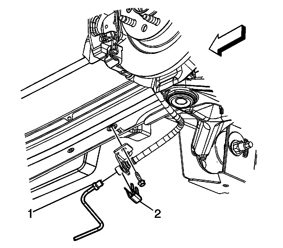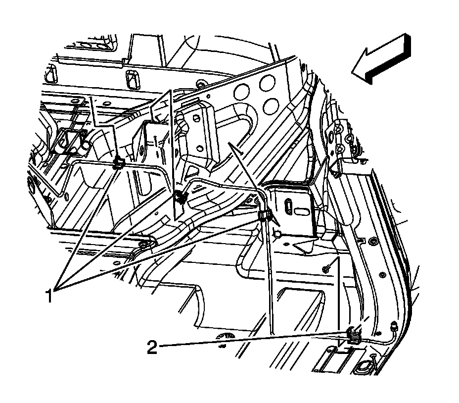 7. Install the pipe clip (2) to the floor panel tunnel brace stud.