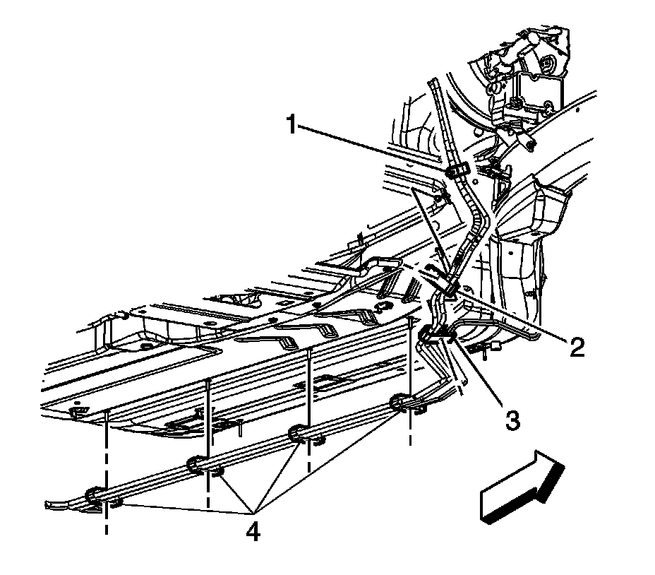6. Install the pipe clip (3) to the floor panel tunnel brace stud.