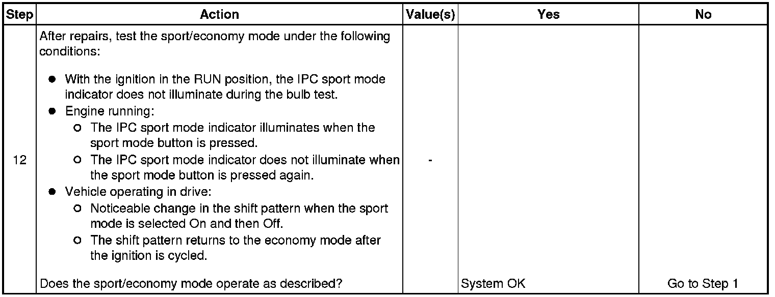 The TCM evaluates the request, and if operating conditions are correct for enabling the program, the TCM sends a confirmation message to the ECM. The ECM then requests the instrument panel cluster (IPC) to illuminate the sport mode indicator.