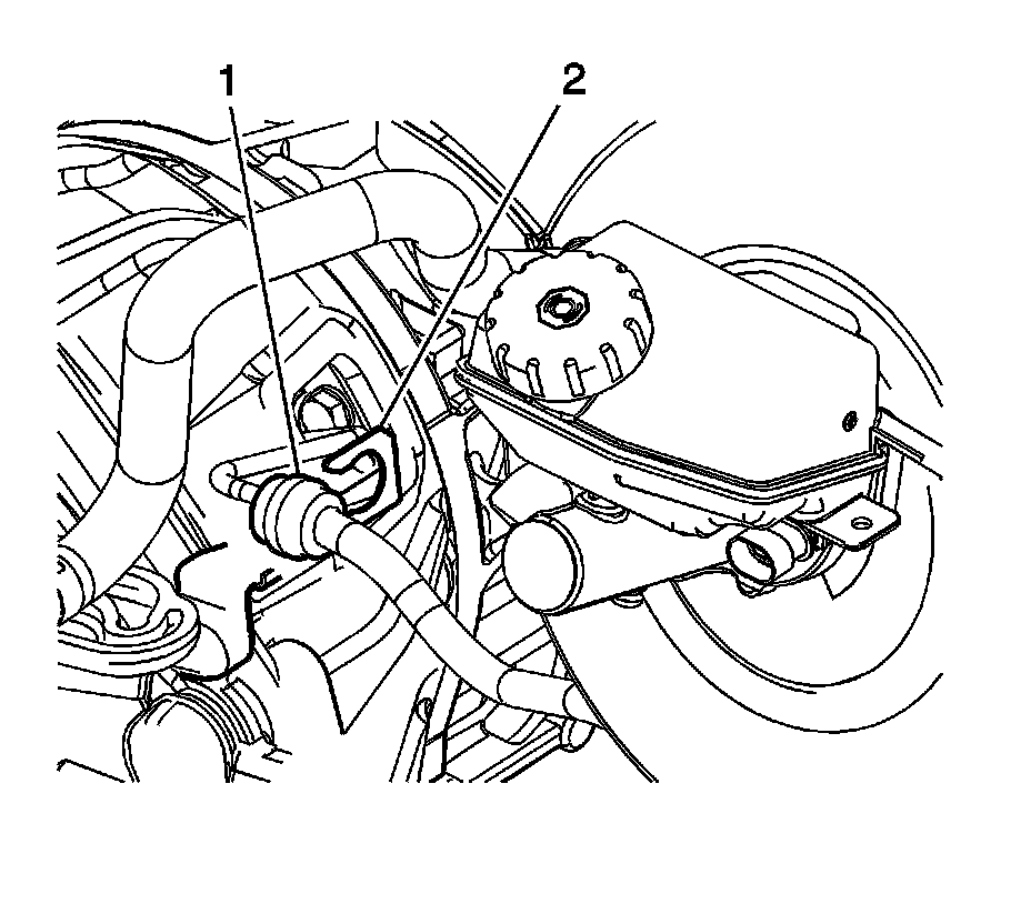 4. Remove the clutch hose/pipe assembly retainer clip (2) from the clutch master cylinder.